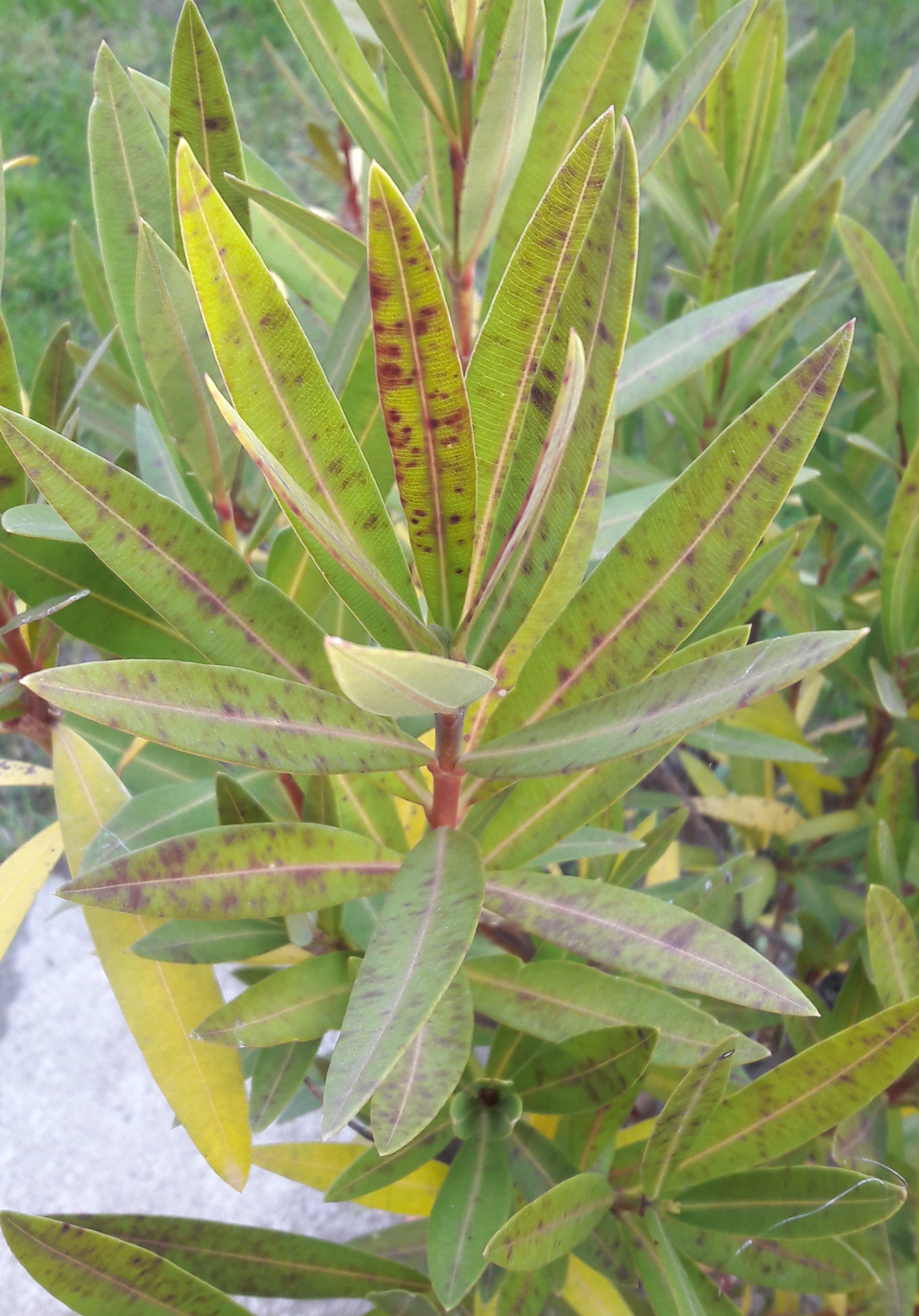 A leander sokféle betegsége közül az aszkohitás gomba támadta meg a növényt. A fertőzés okai összetettek: a leander tartási körülményei nem optimálisak /túlöntözés, tápanyag helytelen adagolása, sok fény vagy fényhiány, stb./ A betegség elhatalmasodása ellen hatásosak a réztartalmú gombaölő szerek - pl. a Cuproxat/ A teleltetés előtt - szabadban vagy tároló helyen - érdemes volna visszavágni. Ezzel a növény "megújul"és jövőre újra virágzik és a foltok is eltűnnek.