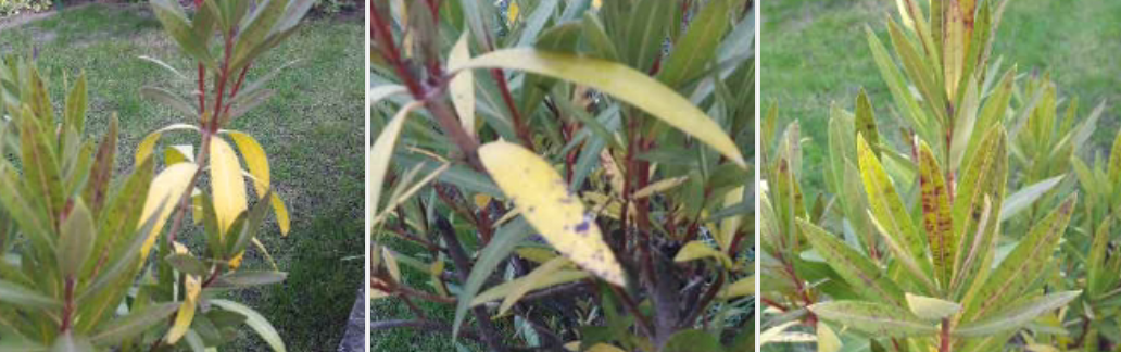 A képeken látható elváltozás jelent meg a szeptemberi sok eső után a leanderen. Mi a baja és milyen kezelést javasol?