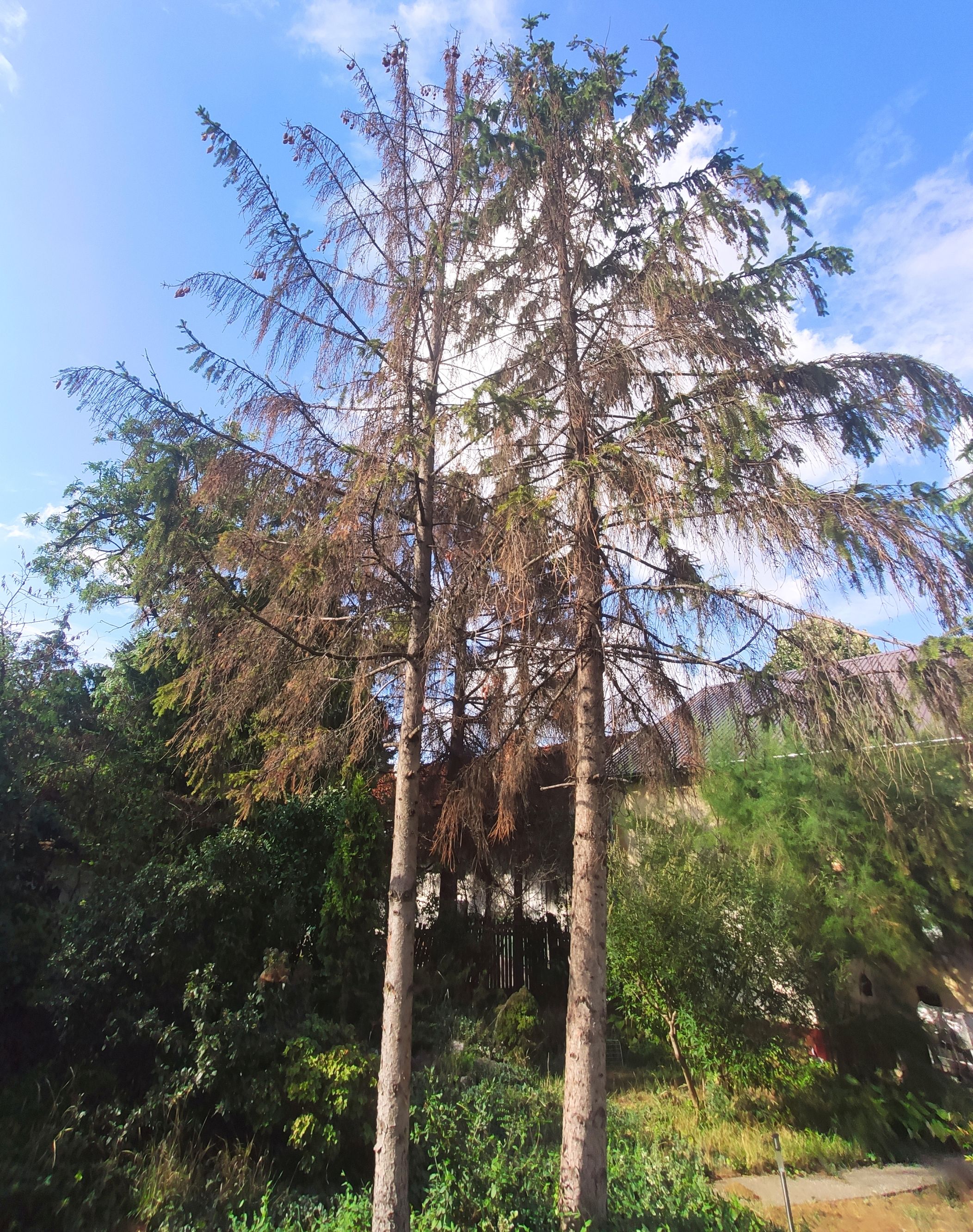 Egyszerre 5 fenyő lett beteg hirtelen ahogy a képeken látszik. Gyorsan alakult ki ez az állapot. A madárbirsről azért csatoltam képet, mert hasonlóan gyorsan ott is teljesen leszáradnak ágak, lehet egymást fertőzték, vagy ugyanaz a baj, hátha segítség. Mi lehet a probléma? Tudok valamit tenni?