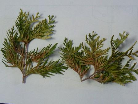 Két problémával fordulnék Önökhöz. Az egyik küldött képen Thuja occ. Yellow Ribbon hajtások láthatók, amelyeket tavaly telepítettem, és szeretném tudni, mik ezek a barnulásos tünetek és mivel segíthetnék rajta. A másik kép babérmeggyekről készült. Kérem írják meg véleményüket. Köszönettel: Balogh Ágnes