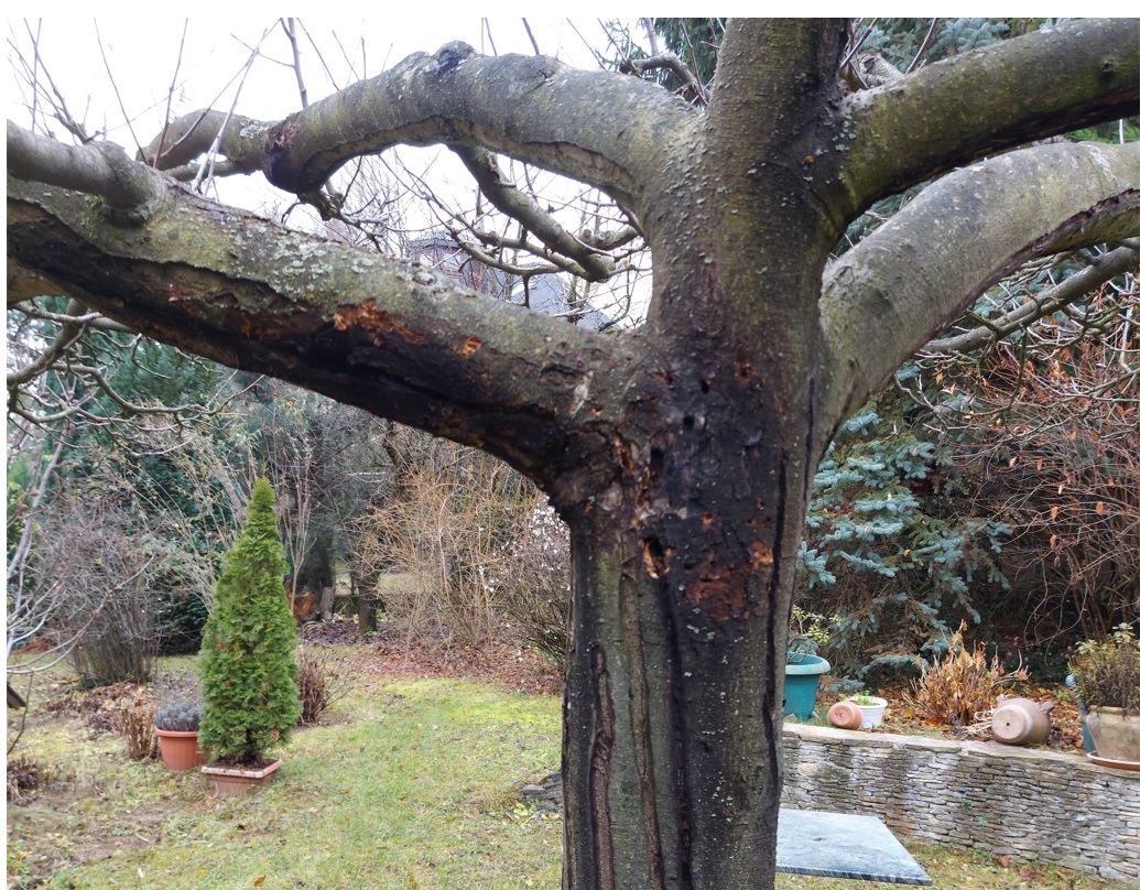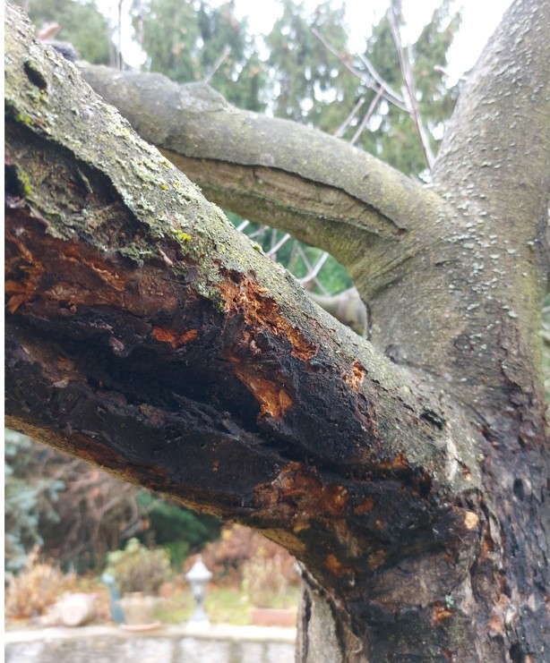 Kb. 20 éves mutsu almafa kérgén kialakult fekete foltok kezelésének módjára tudnak adni javaslatot? A foltokat a harkály már megtalálta.