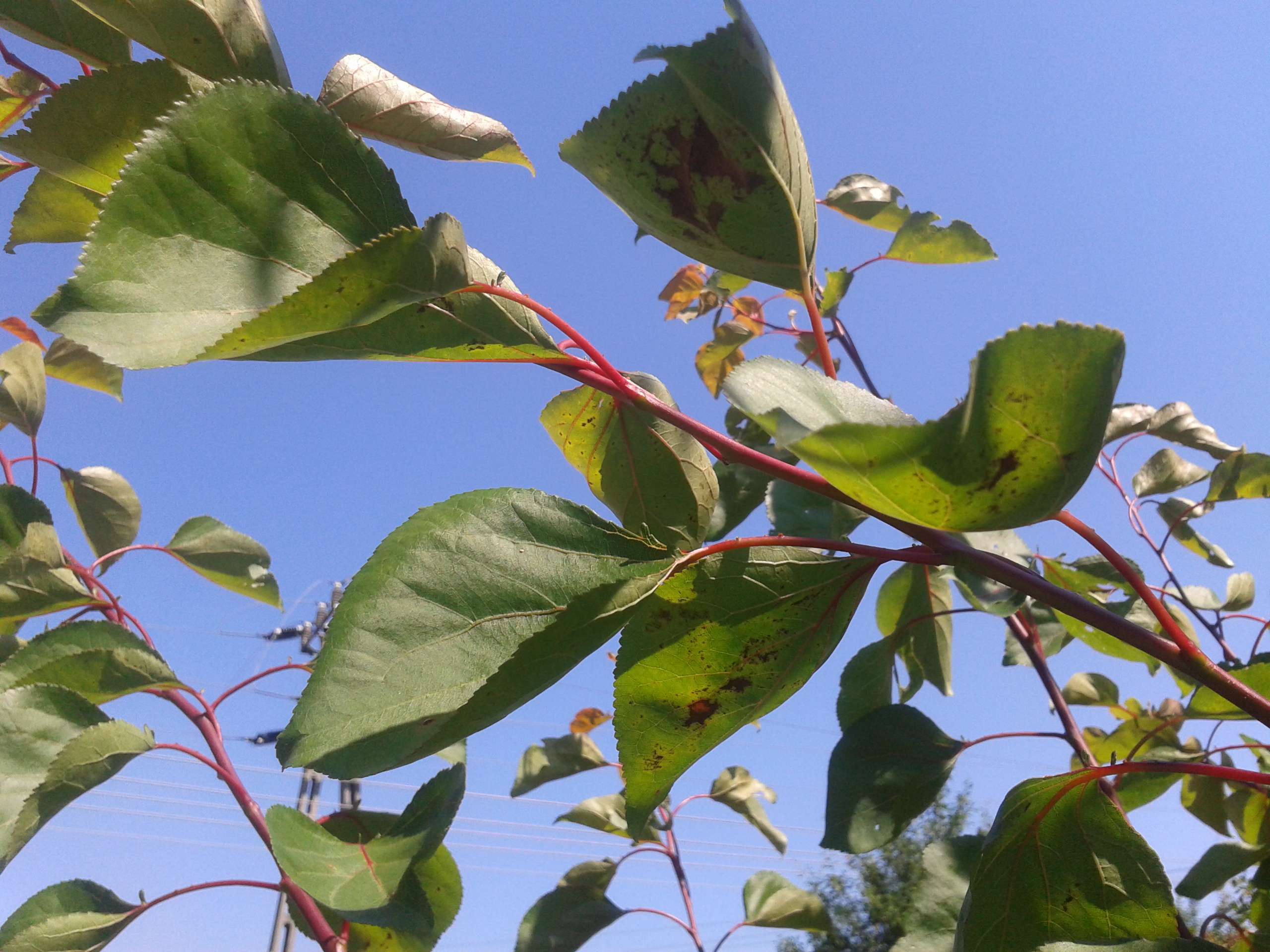 A kajszinak van egy gyakori gombabetegsége, mely korai lombhullást okoz. A képen látható foltok nem erre utalnak, nagyon különböző formájúak és méretűek, ezért esetleg a permetlé töménysége nem volt megfelelő.