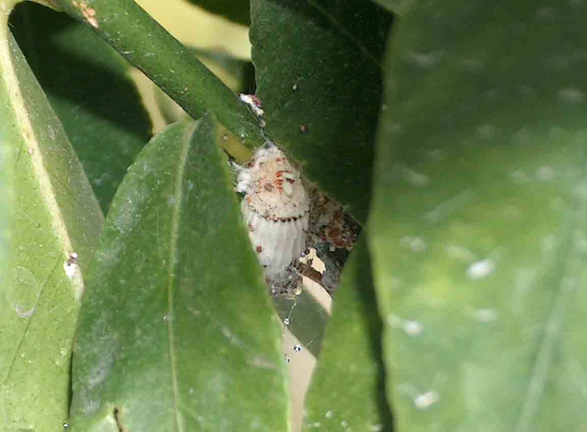Még annyi hozzáfűznivalóm van, hogy én leginkább vmiféle petefészeknek nézem, a belsejében narancssárga kissé összeálló porszerű anyag van. Az a fehér rész papírszerű, bordázott, körülötte pókhálószerű rész, melyen kis cseppek vannak, mintha a harmat csapódott volna le rajta(de nagyon ragad). Eddig a levél fonákján és a száron találtam ezt a micsodát