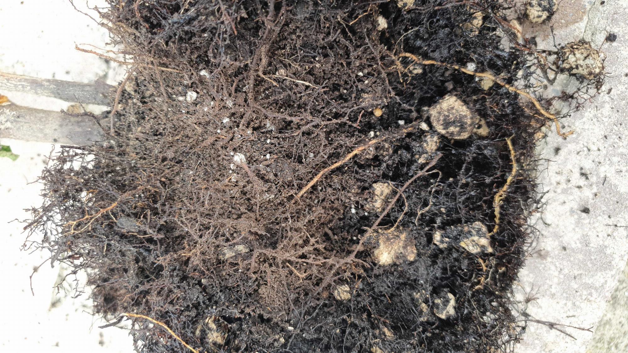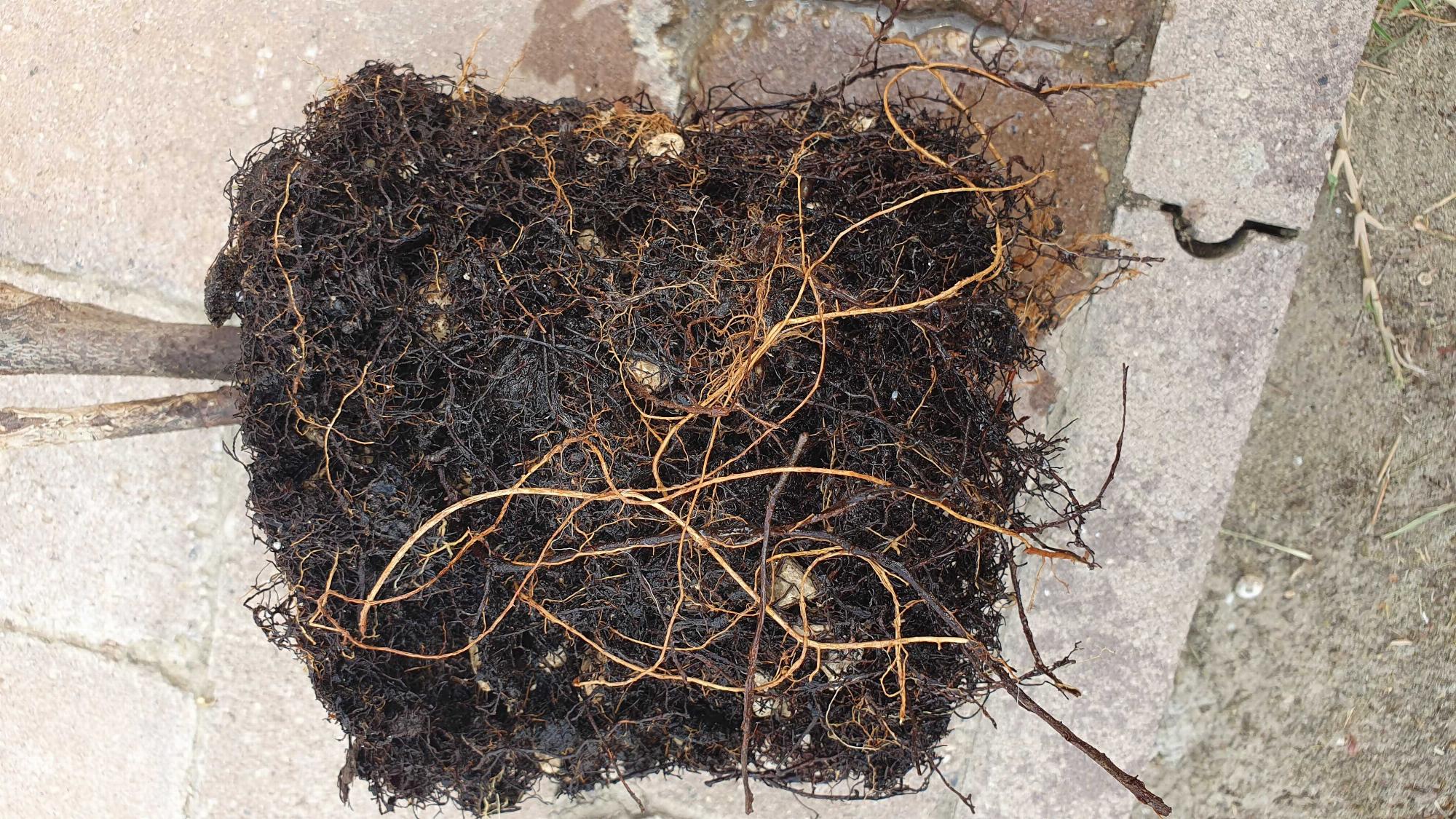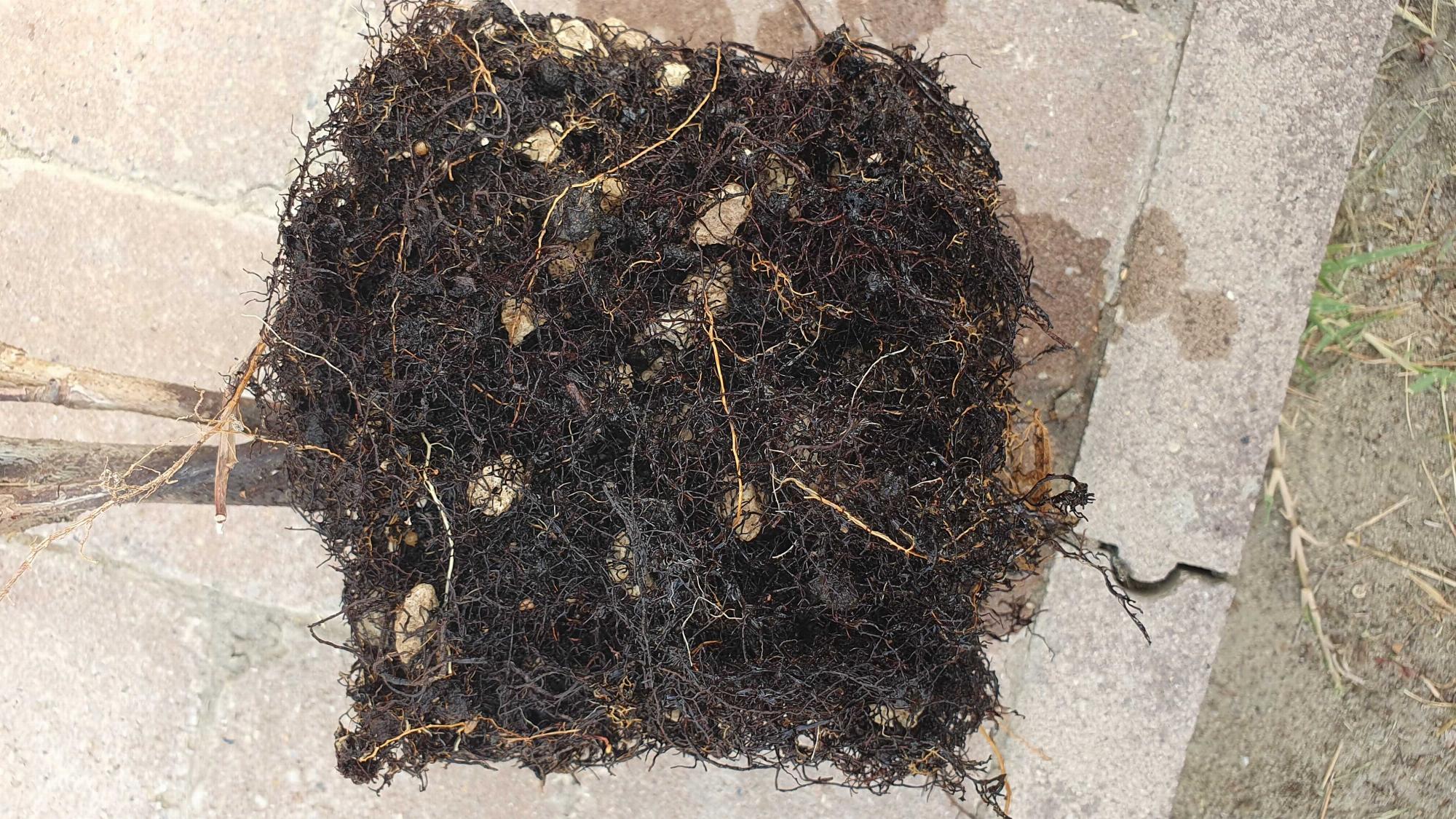 Kiszedtem egy tövet a gyökeresedés minimiális. A konténer földbjében maradt a gyökérzet 95%, itt-ott van néhány gyökér ami növekedni kezdett. 4,5 hónapja lettek kiültve ennyi idő alatt gondolm nagyobb gyökérzetnek kellene lennie.