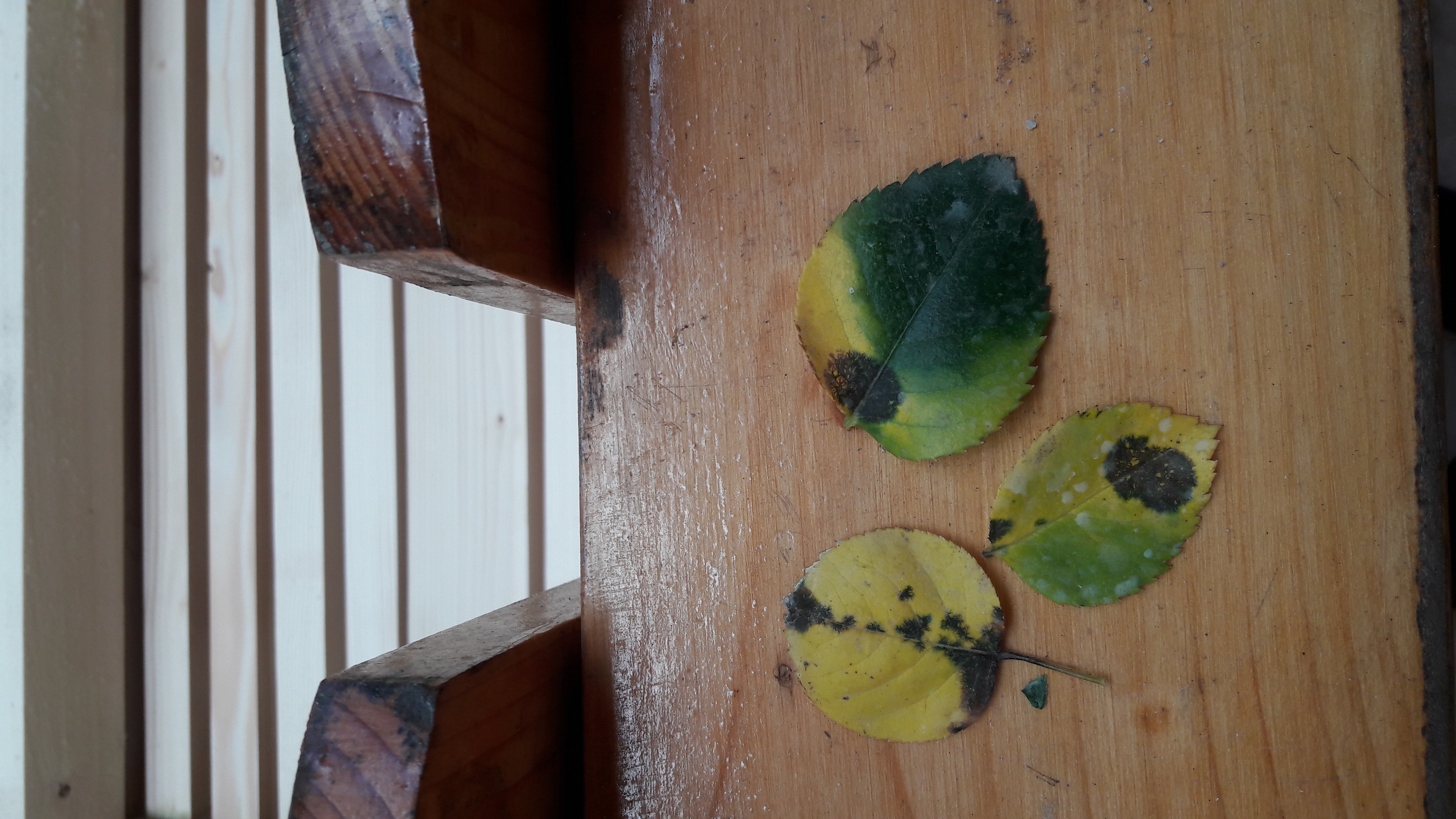 A képeken a rózsa diplokarponos levélfoltossága látható. A lehullott leveleket el kell távolítani. Réztartalmú szerekkel, dithan-al lehet ellenük védekezni.