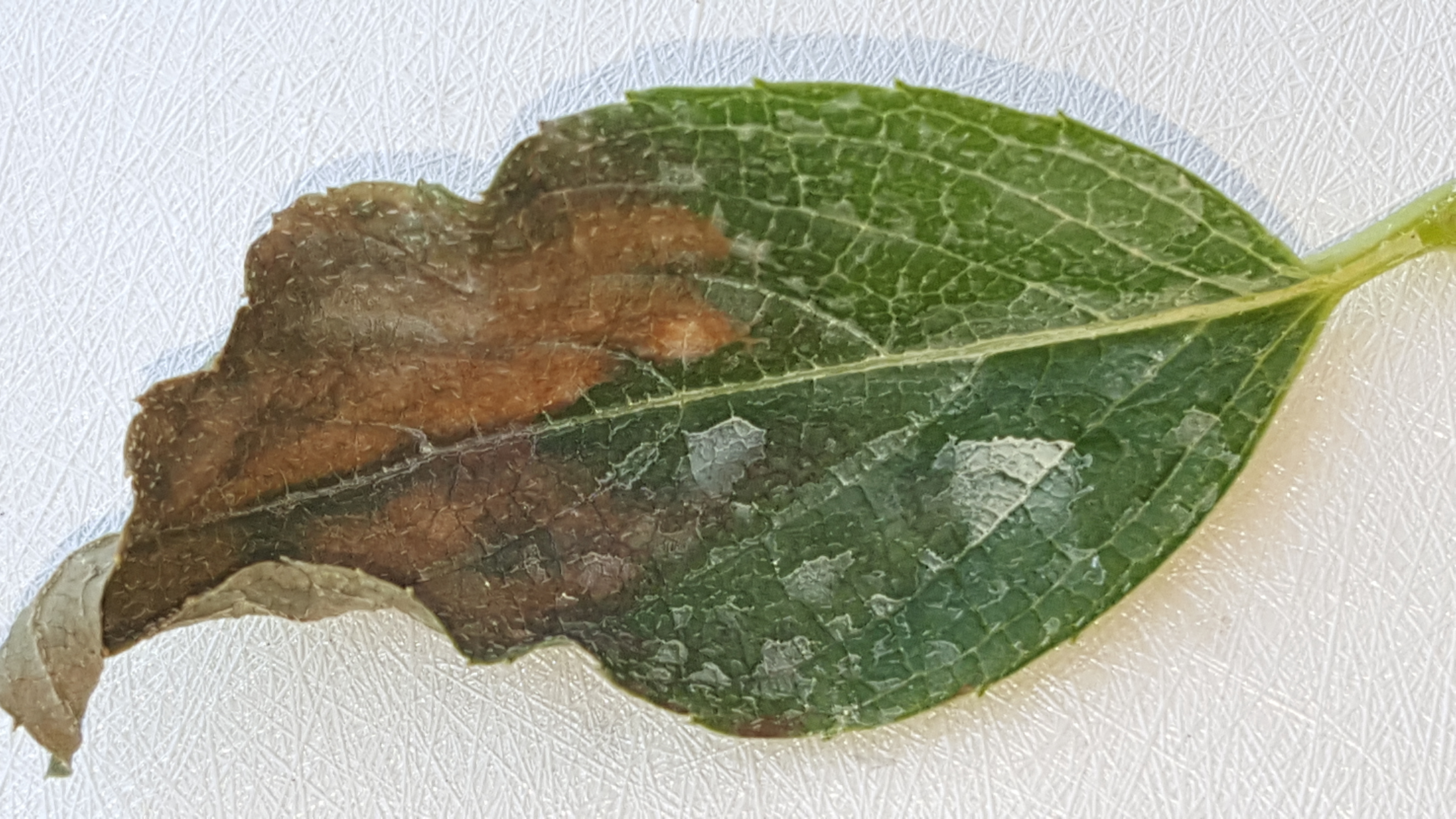 Hortenzia levelei pár nap alatt papír szárazra száradtak. Nagyítóval sem látok semmi kártevőt a levélen. Fertőző, mivel a 1,5 m-re, azonos egészséges hortenzián is kezdődik ugyanez, a beteg növény irányából. Dithan és Mospilan permetezés ellenére halad a betegség.