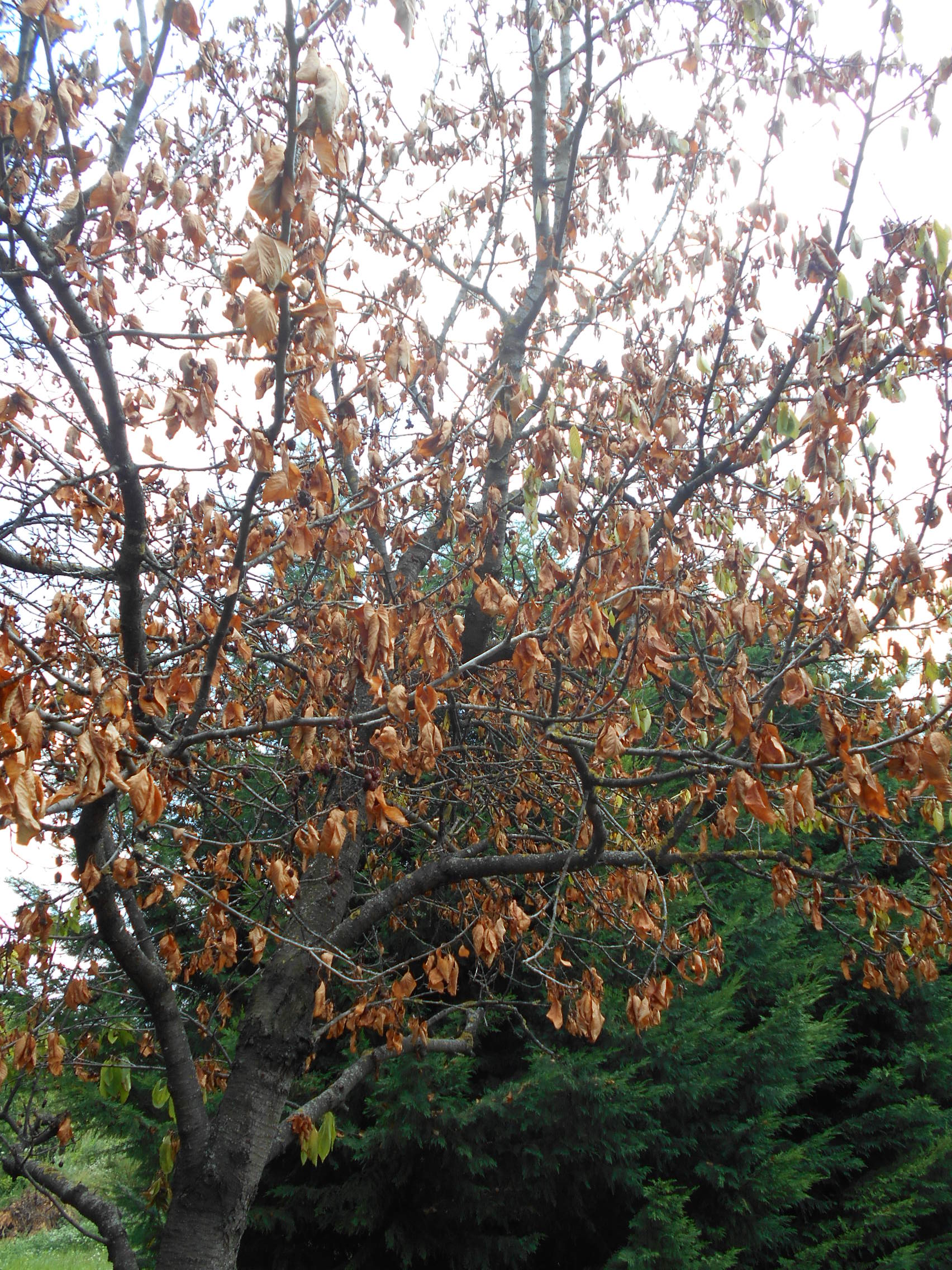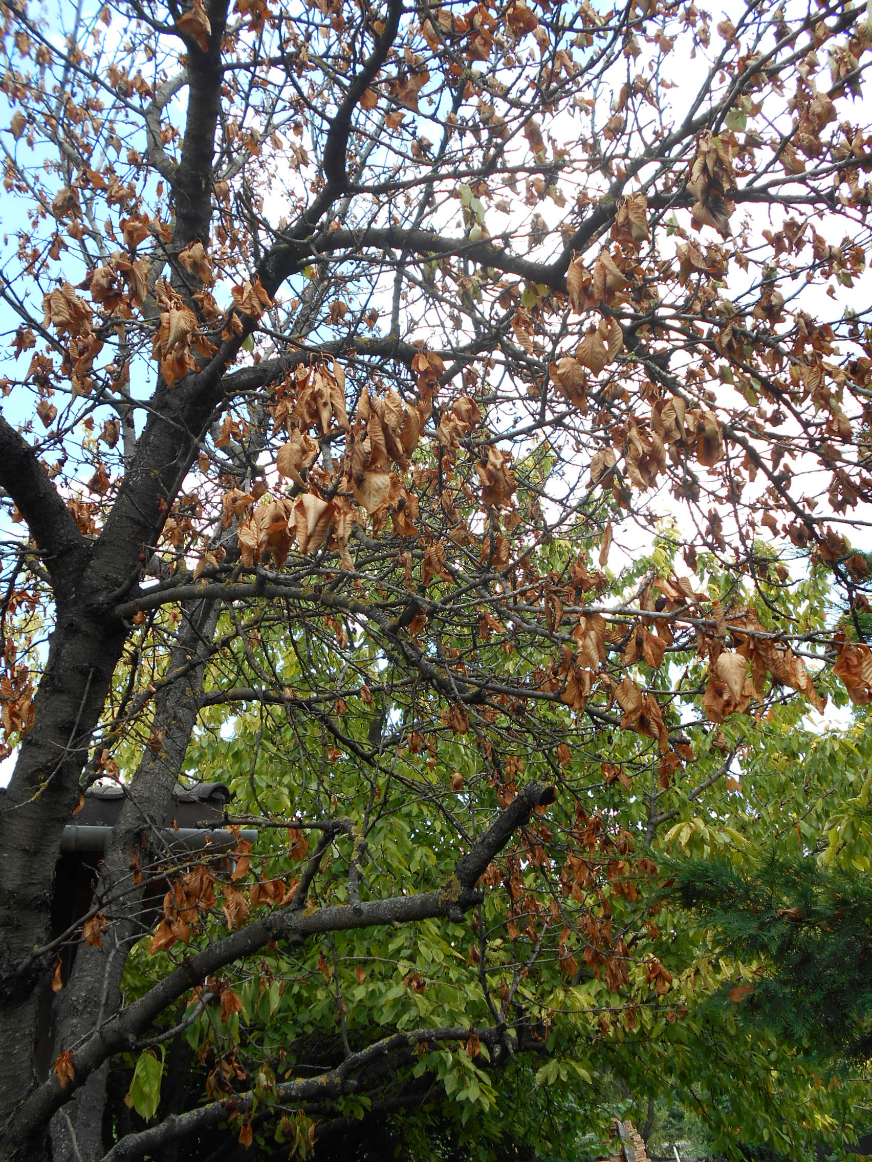 Az idén is gyönyörűen virágoztak, de aztán az egyik fa levélzete feltűnően sápatag lett, a szokásos energiától teli zöld színű levelek egyre haloványabban lógtak, ami a termés idejére is így maradt. A gyümölcsök beérése után rövid idő alatt teljesen összeszáradtak a levelek, de a fán maradtak. Ma is ott lógnak, szinte az összes levél. A fa a teljes kiszáradás tüneteit mutatja. Csatolok képeket.