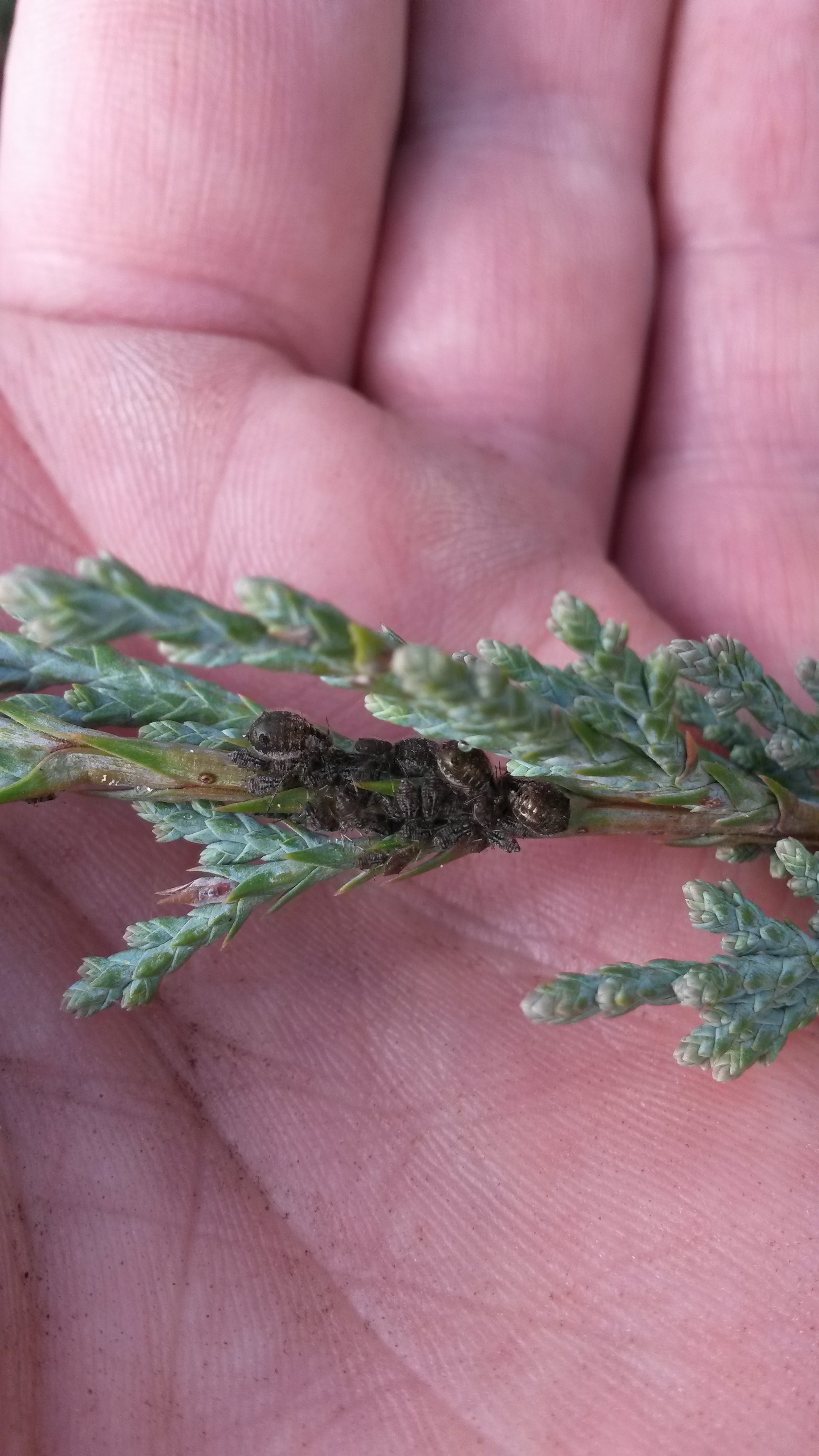 Rosszúl írtam, manuálisan a Boróka kéregtetű-t szoktam írtani ha van. Elég jól látható kis fekete vérző kártevők.