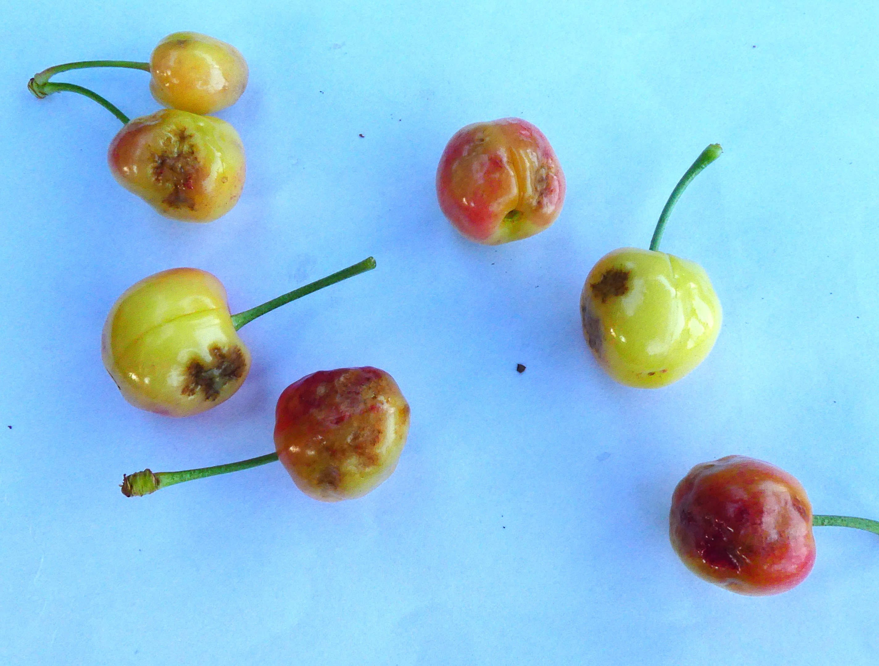 Gyümölcsfertőző monília tünete. Sokhelyütt látni, elkeserítő, főleg zártabb állományokban, fogékony fajtkon. Nagyon "moníliás év" az idei, nehéz volt megvédeni a fákat időben. A tünetes gyümölcsöket ösze kell gyűjteni, legjobb, ha a cseresznyefa alá ponyvát, fóliát tesz, hogy a beteg, hullott gyümölcsöket arról könnyebb összegyűjteni (és a cseresznelégy lárvája sem tud bejutni a talajba bábozódni).
