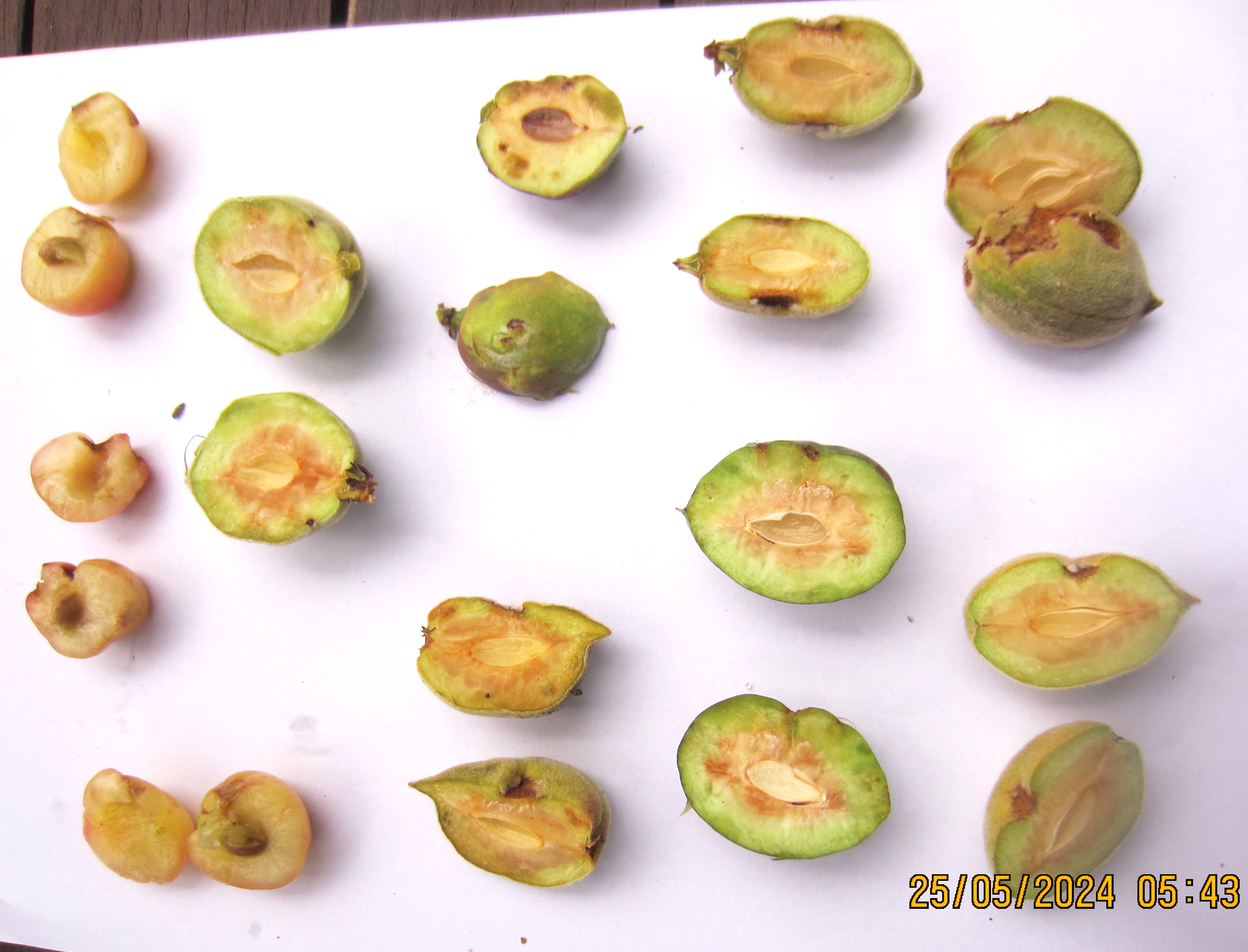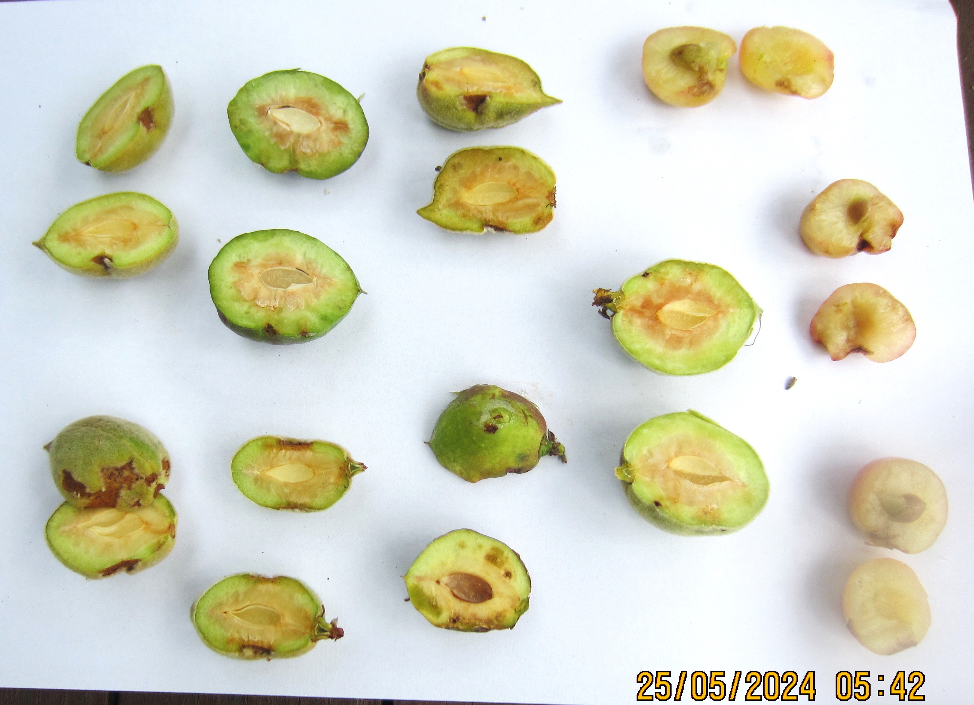 Újra és újra átnézem a felvételeket. A torz gyümölcsök azt mutatják, hogy a fejlődési folyamat valamikor megszakadt - alapvetően két különböző stádiumban. A korai stádiumban sok a torzulás, a későbbiekben inkább parásodás, stb.látható. A torz gyümölcs belső részében vannak- e barna beszűrődések? A későbbi fázisban van-e ilyen?