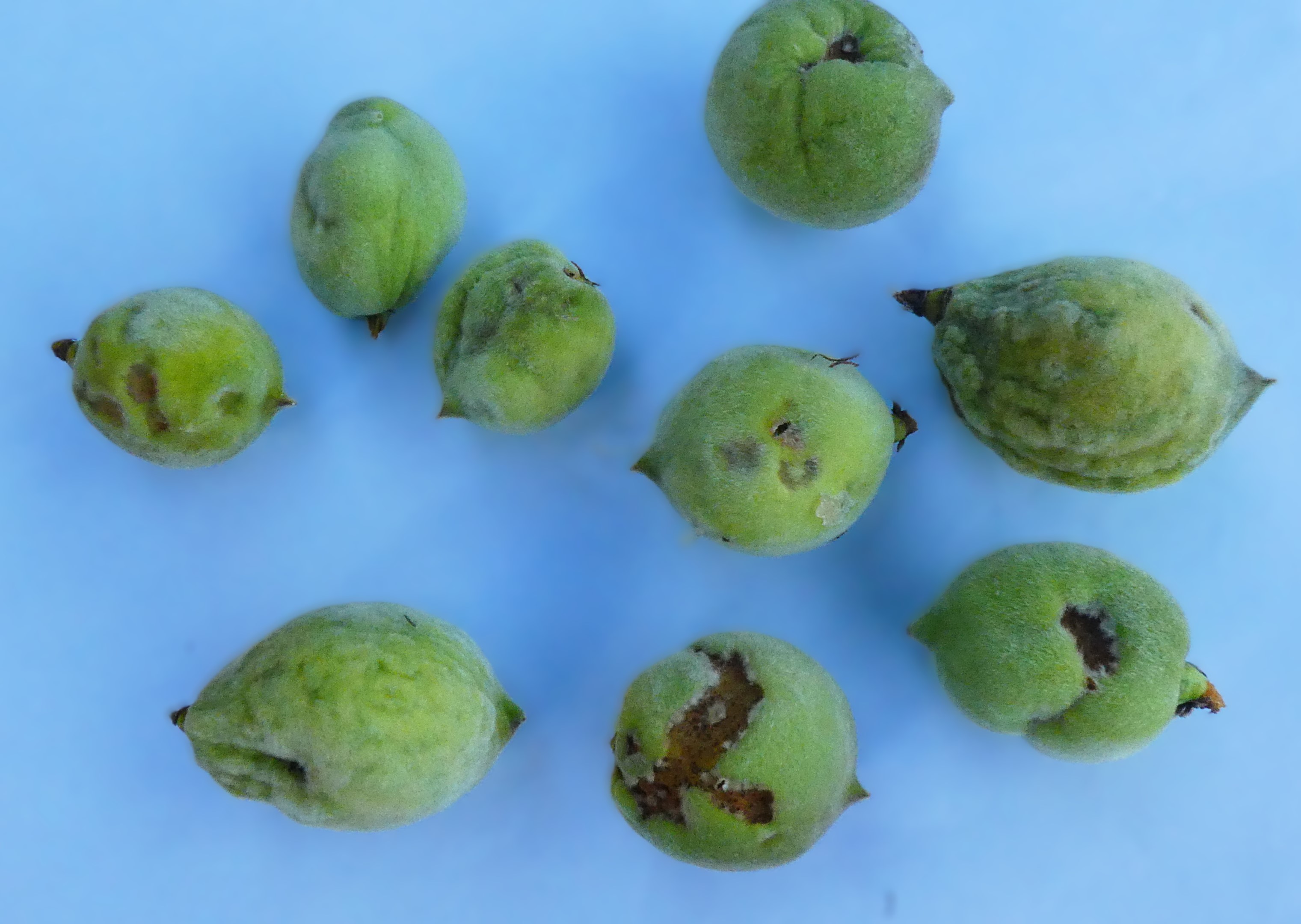 Kertem Pákozdon családi háznál van. Két éve vettem észre , hogy az őszibarack fámon torzult -mintha jégverte lenne- gyümölcsök jelentek meg.