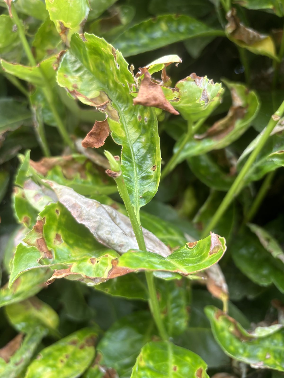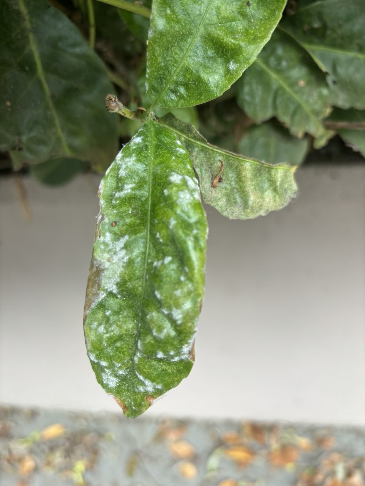 Pseudomoas syringae okozta baktériumos levélszáradás az ok a lisztharmat mellett. Túlságosan nedves, párás a környezet, illetve túl sok nitrogént kap a növény. Réz+kén permetezés javasolt. A tünetes levelekt el kell távolítani. A metsző eszközöket fertőtleníteni hipós vízzel. Magas magnézium- és káliumtartalmú műtrágyát adjon talajon keresztül. Lombtrágyát egy másik permetezéssel.