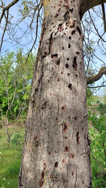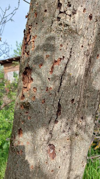 A "beteg" törzságat célszerű volna kifürészelni. A lyukakat farontó hernyó okozza. Az biztos, hogy a fás részekkel táplálkozik, de a most lyukakat a hernyó után kutató madarak is okozhatják. A kéreg és azon belül a háncs szöveteit rágják a hernyók. A kérget leválasztva láthatóvá is válnak akár a hernyók is.