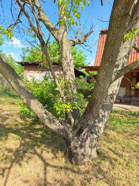 Tavasszal vettük észre az egyik diófán a képen látható elváltozásokat. A négy törzságból csak az oldalsó (szomszéd felőli) kettőt érinti kb. 2-3 méter magasságig. Ezek ágain a levelek sem hajtottak ki. A másik két törzság egészséges, a felső ágakon egészséges levelek, termések.