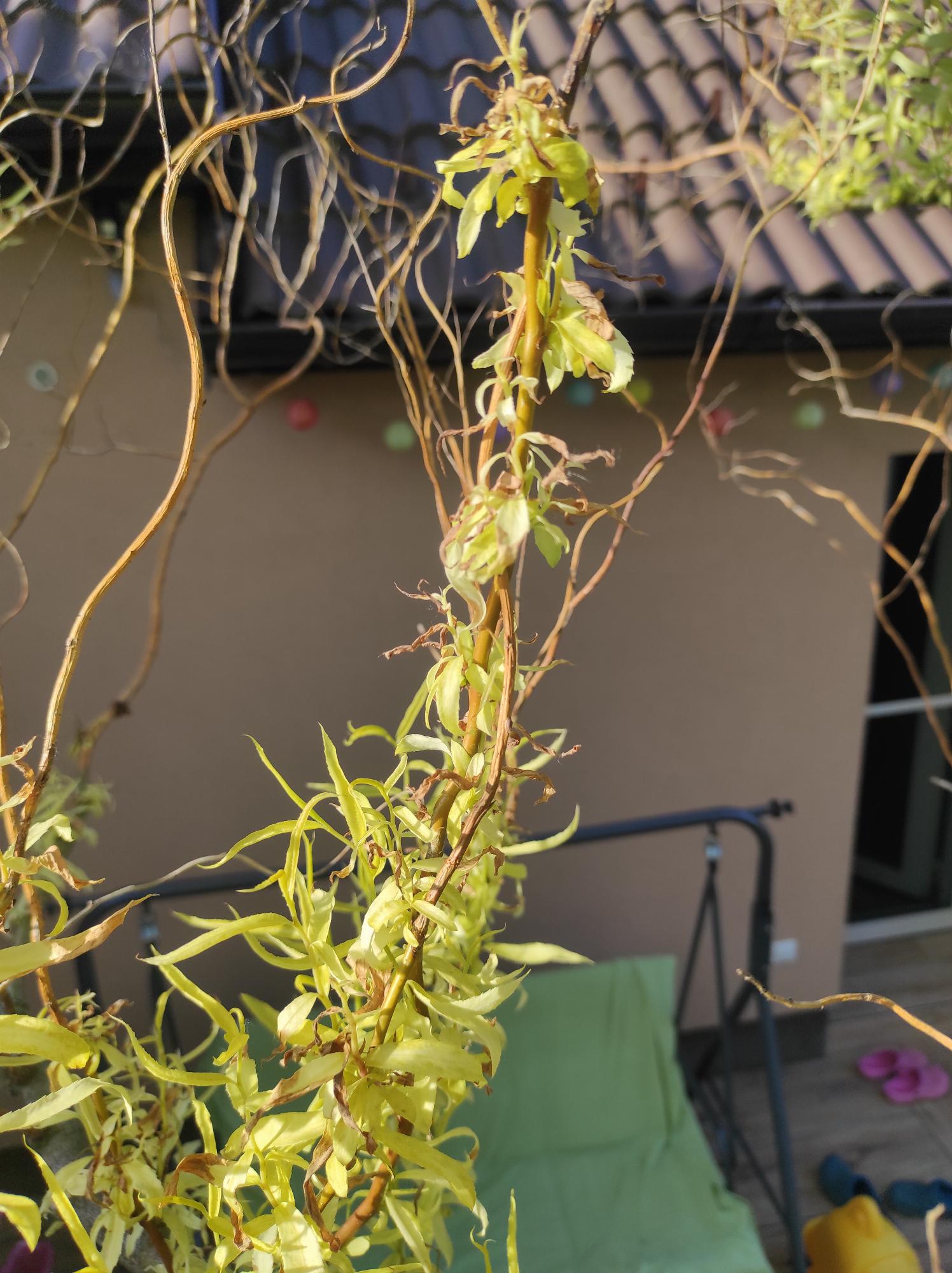 Tizenéves csavart fűzfánk második éve produkálja, hogy miután a levelek tavasszal kifejlódnek, világoszöldek maradnak és elkezdenek száradni.