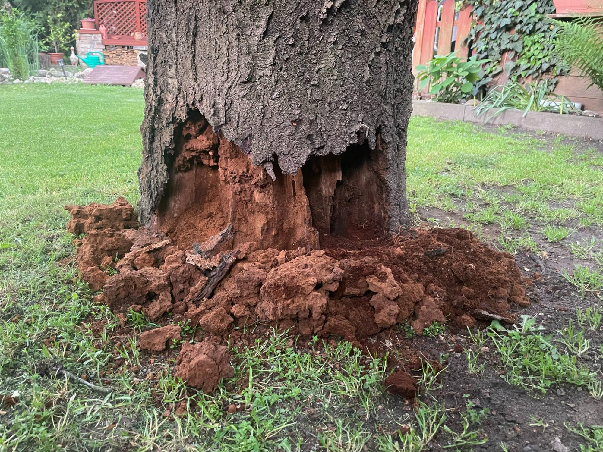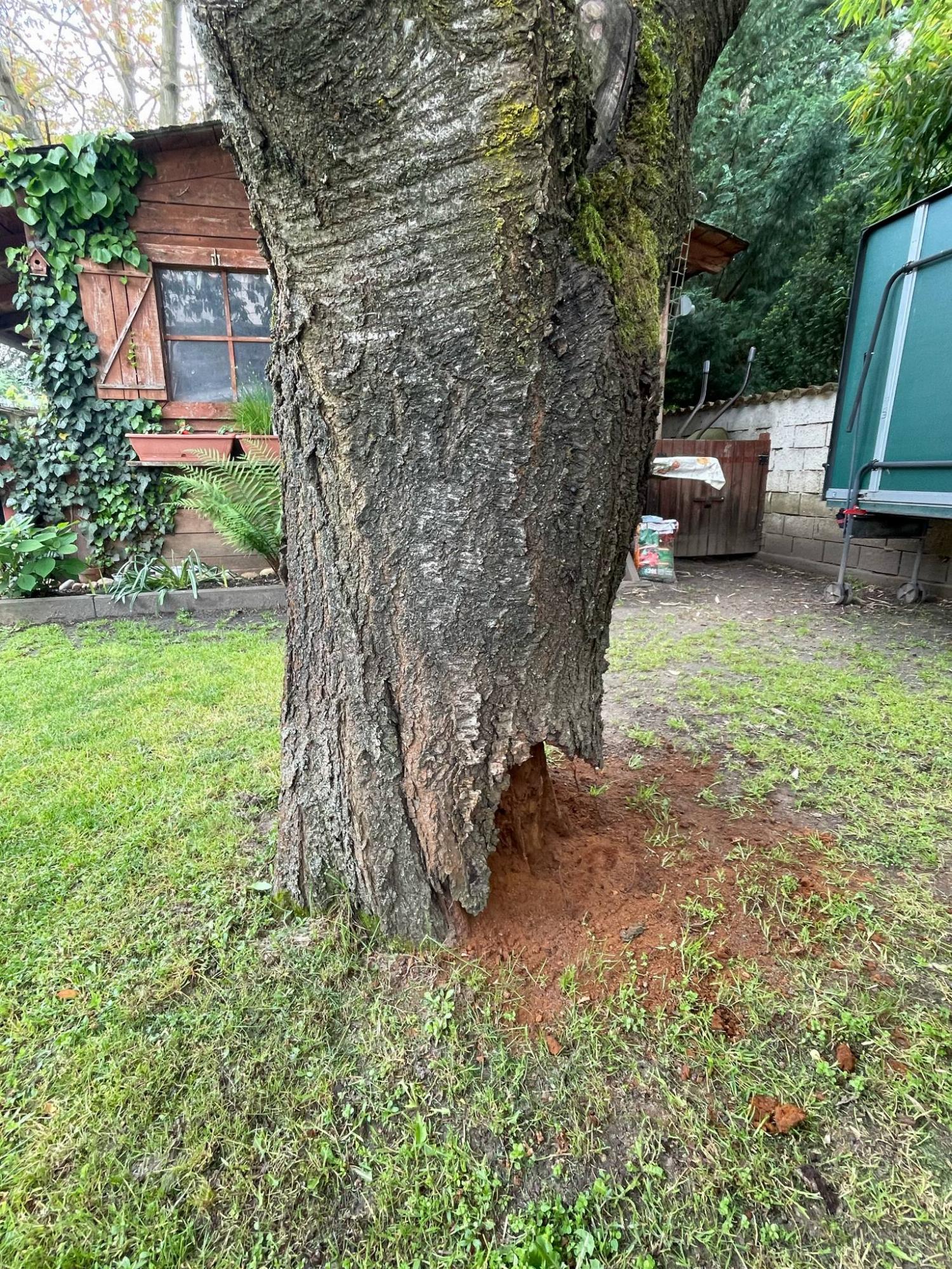 Észrevettük, hogy a fa törzse a föld színén kezdődően korhadt a kérge illetve alatta porzik, darabokban lejön. Ez kb. 1/2 méteres magassági tart, a törzs üreges, ha megkopoktatjuk kongó