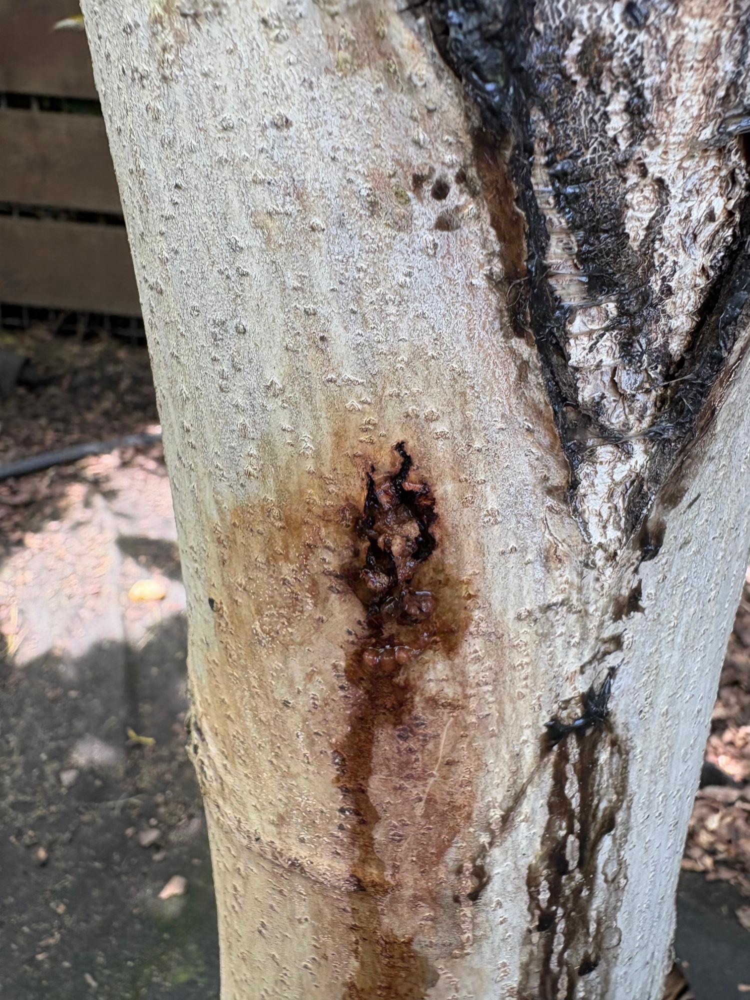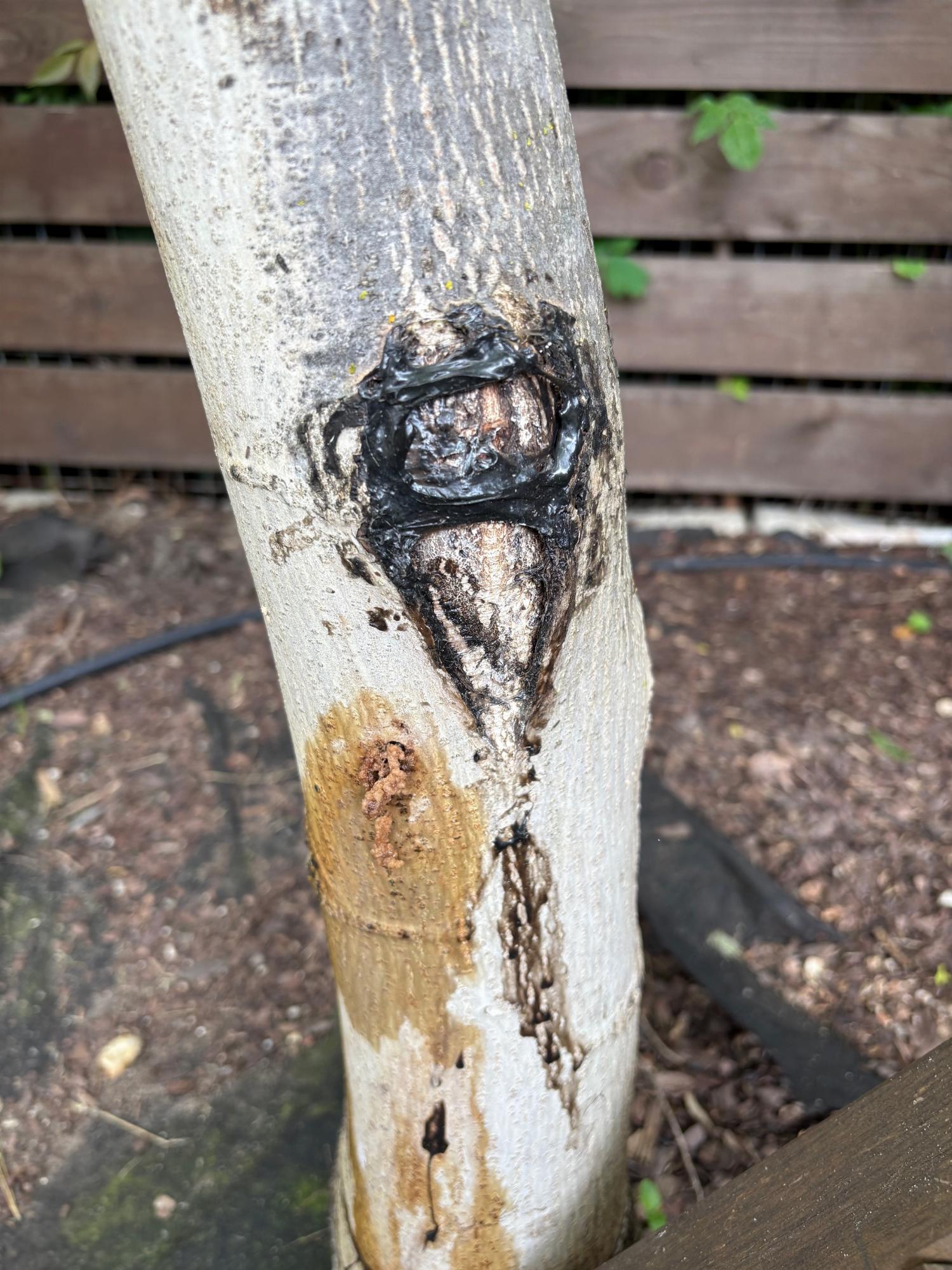 Idén sajnos új sebet találtam, ahogy a képen is látható. Vékony dróttal ezúttal is megpróbáltam 'felszúrni' hátha sikerül a kéreg alatti kártevőt 'elkapni' de nem tudom milyen sikerrel. A fa amúgy szép, egészségesnek tűnik (lásd képek) de aggódok a hosszú távú növekedéséért.