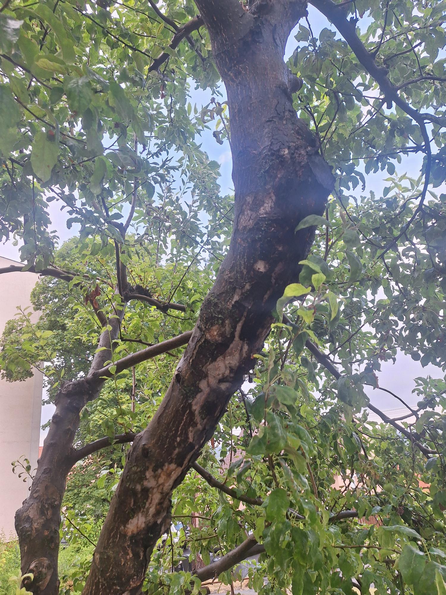 Kedves Klárea! Sajnos az almafa nagyon súlyosan beteg, túl nagy felületen van kéregpusztulás, a taplógomba is megtámagda, valamint a szúbogarak is berágtak. Nem tudni, hogy a fa mennyire korhadt belül, mennyire stabil. Koronaalakítás is ráfér, mert elég féloldalas. Kéregkaparással, tisztogatássa, beteg ágak, ágcsonkok eltávolításával, majd réztartalmú szerből kevert péppel, vagy tömény Bordói lével való lekenéssen próbálkozzon meg. Az ágak levágása után a metszési felületről kérnénk képét.