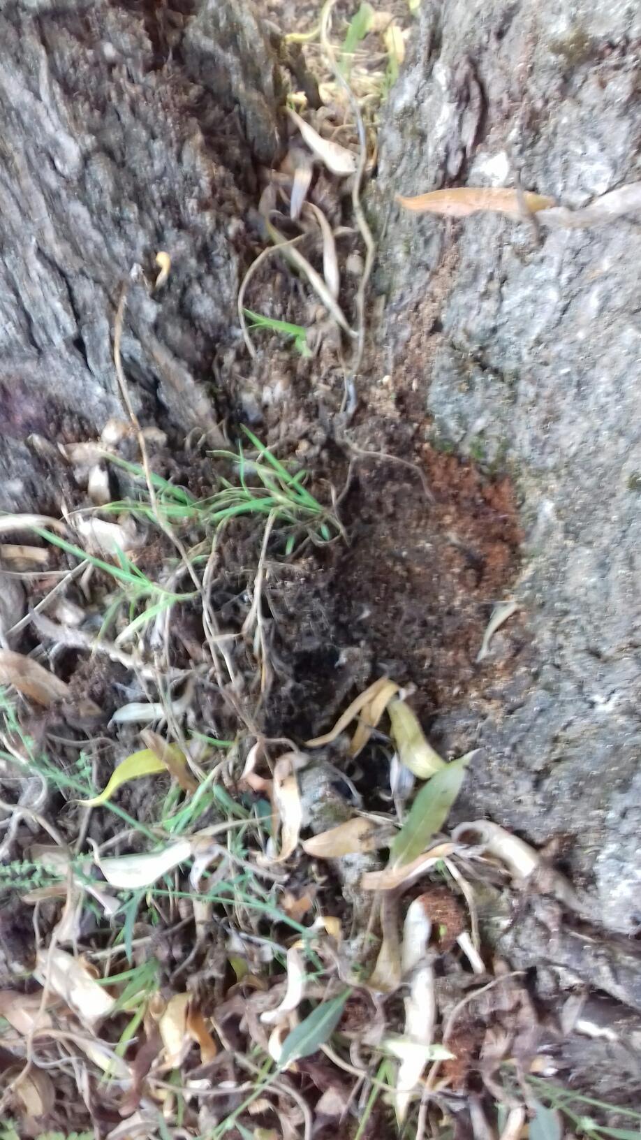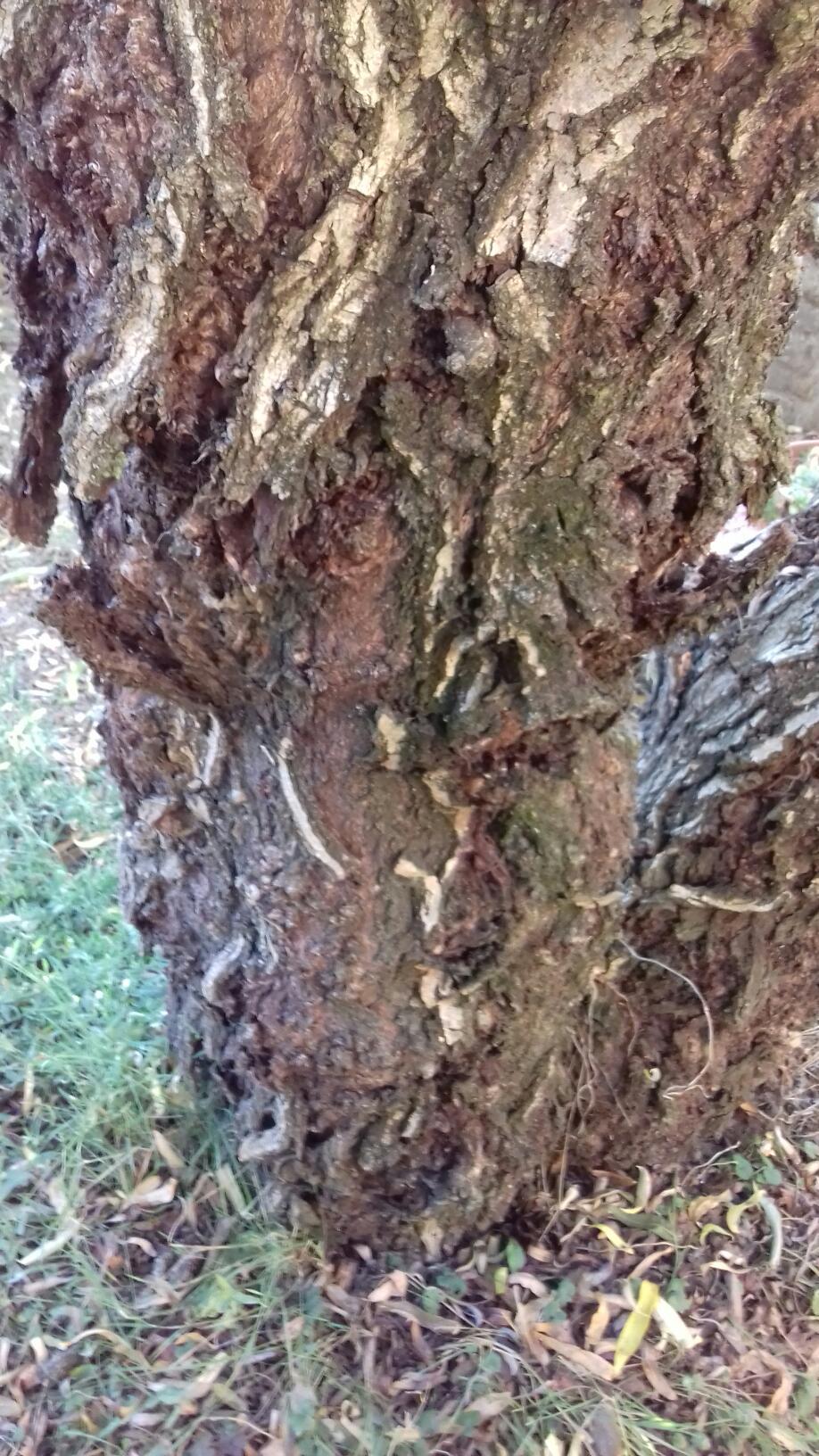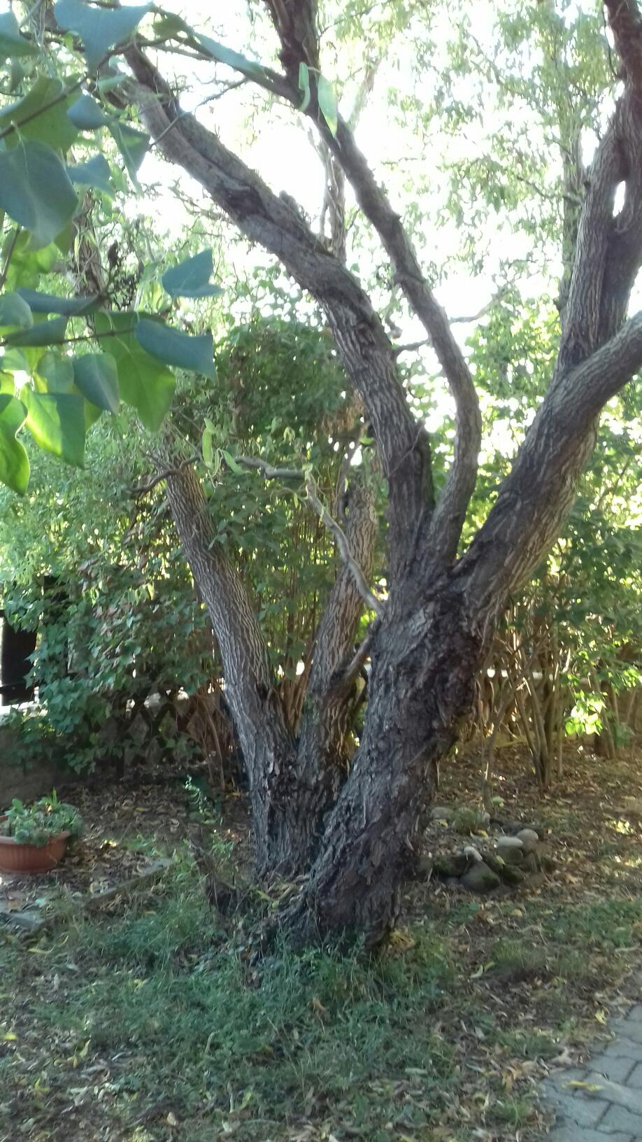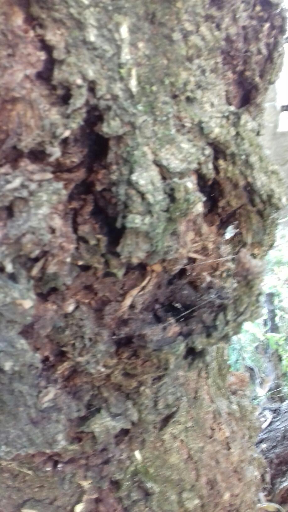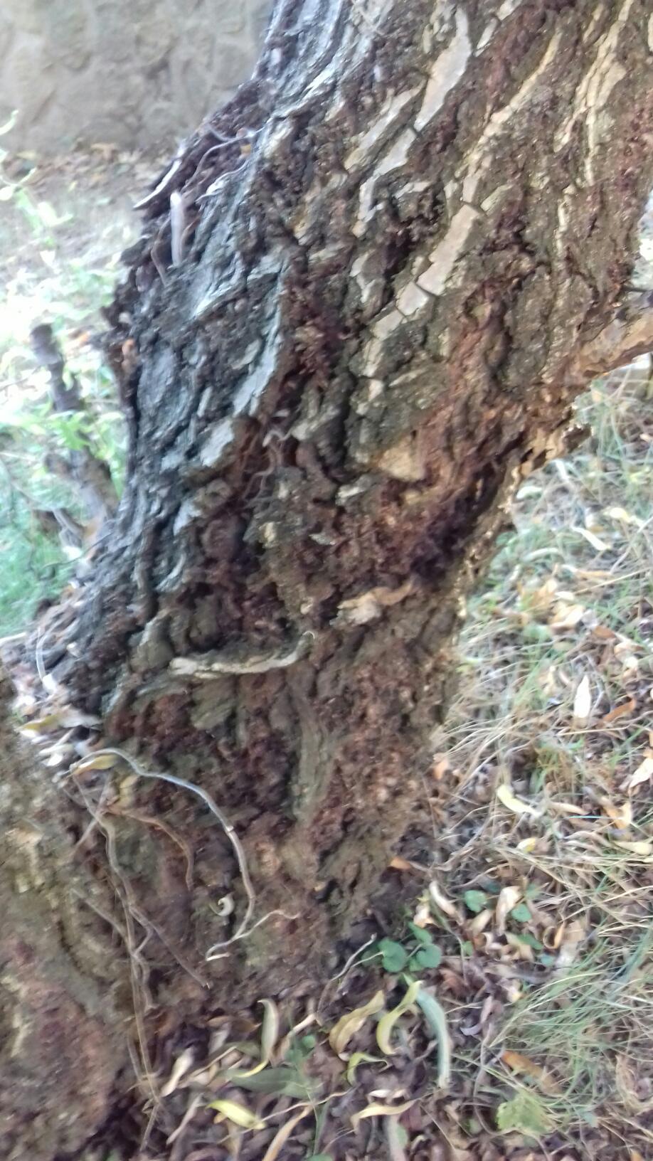 Ami miatt aggódom, hogy a fa törzse két ágú, és alul a talaj szintnél is erősen korhad vagy porlik a két törzs csatlakozásánál. Felételezem, hogy ugyanaz a kártétel, mint fent a törzsön. Tele van hangyával és gomba termőtest is kinő onnan, ezért tartok attól, hogy egy erős vihar rádöntheti a házra.