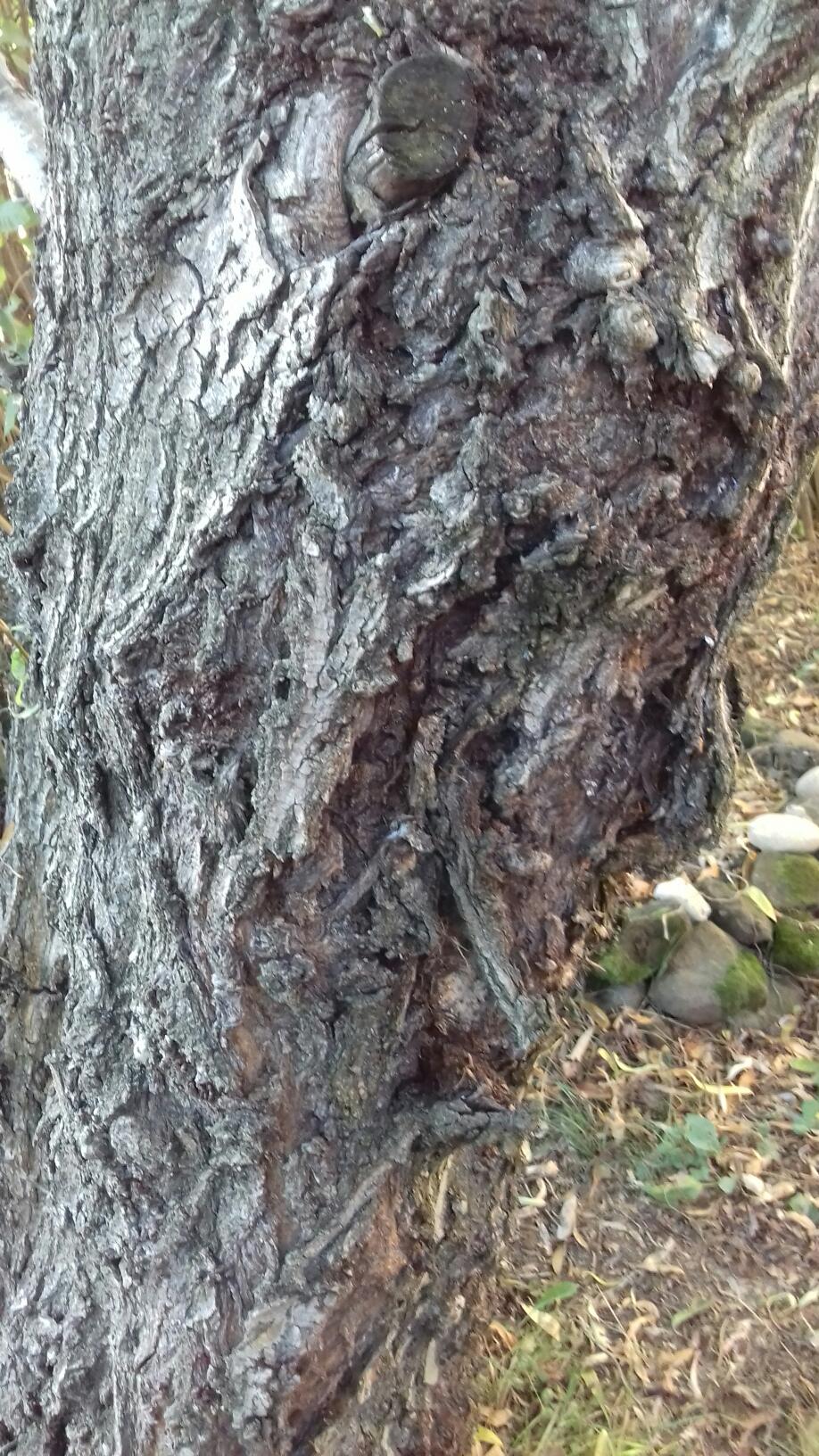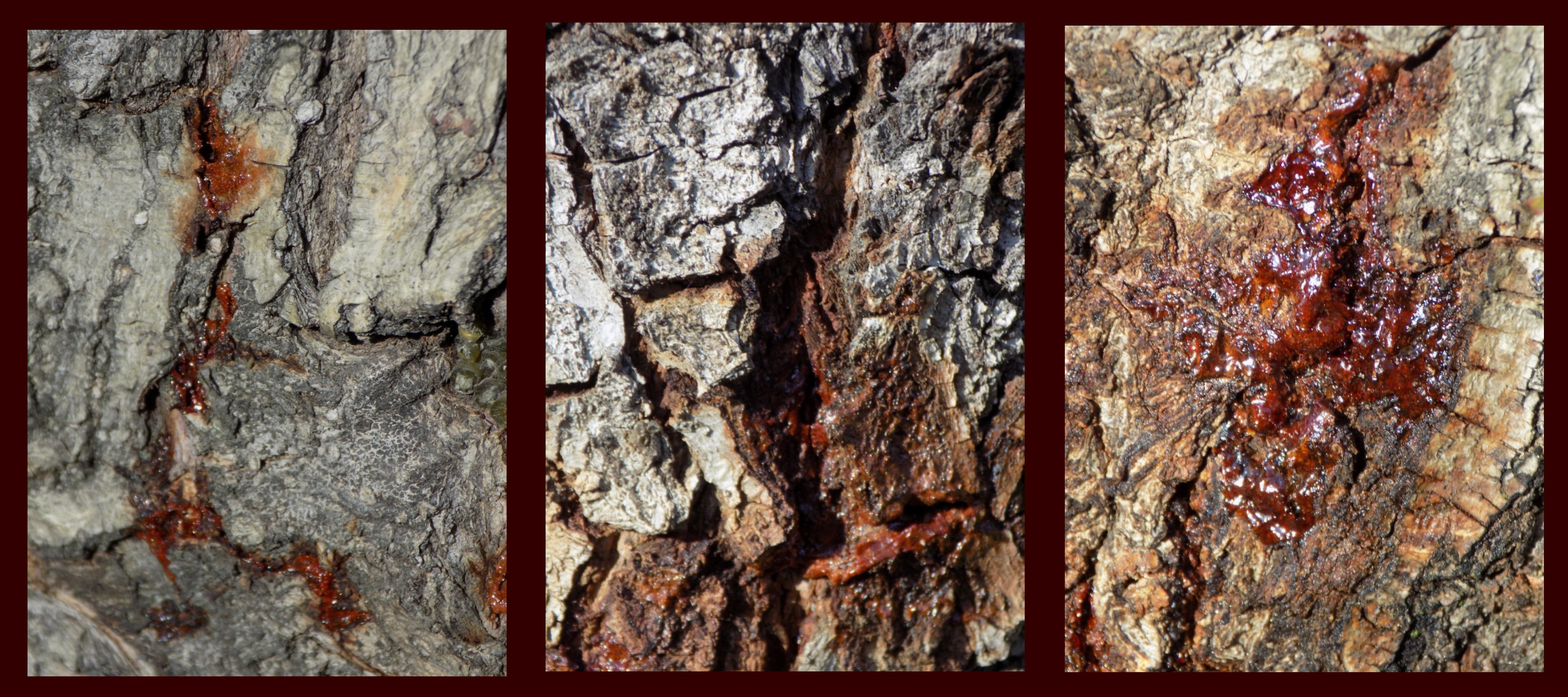 A nedvfolyás - mely mára gyantaszerűen megkeményedett - a fatörzs sérülésekor keletkezett. A képen a folyás kezdetén egy elég nagy lyukat lehet felfedezni, melyet valószínűleg rovar lárva készített. A lárva mostanra már biztosan kifejlődött és lepkeként elrepült. A gyantaképződés jellemző az örökzöldekre, de néhány lombos fafaj - nyár, fűz - is hajlamos erős nedvfolyásra, mely idővel kemény lesz. A nyílást lezárni nem szükséges, mert a kemény védelem miatt újabb rovar lárva nem "költözik bele".