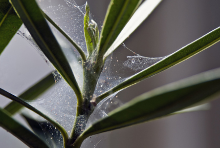 Valyon mi lehet a megoldás a képen látható, pókhálószerű, belül igen aktív életet mutató fertőzés ellen? A növény jól fejlett leander, télikertben Köszönettel!l