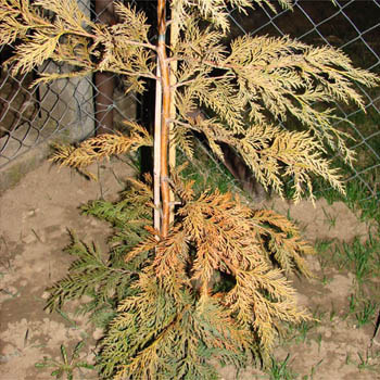 Tavaly ősszel ültettünk sövénynek 25 db 130 cm körüli leylandi hamisciprust. A tél végére elkezdett barnulni, és most tavasszal még jobban látható rajta a barnulás, mint ahogy a mellékelt képeken látható. Mi lehet vele, mi a teendő?