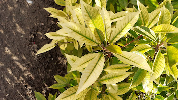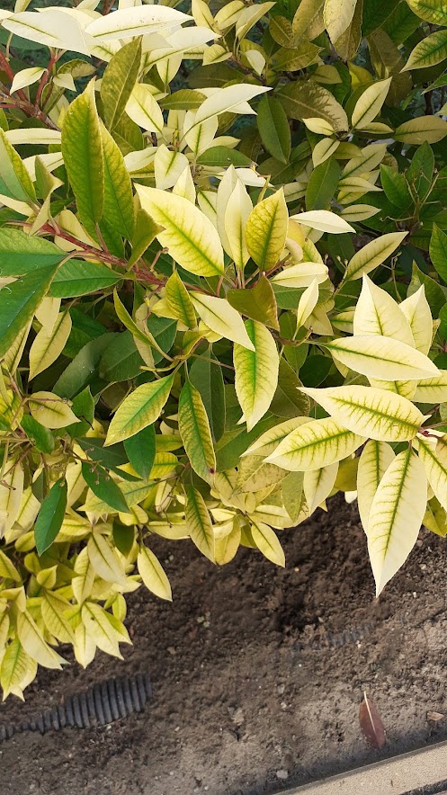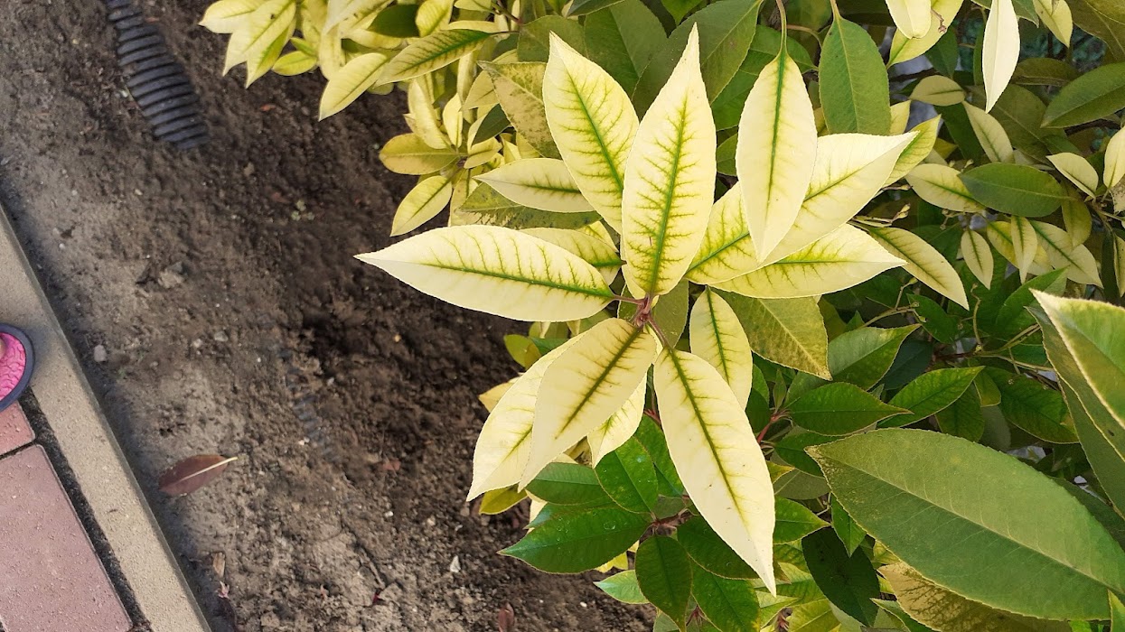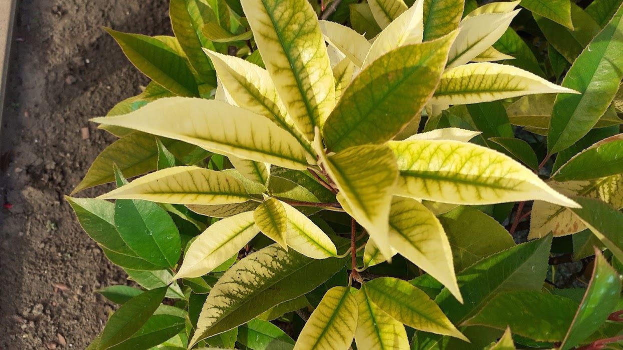 Erős vashiány. Túl meszes lehet a talaj, vagy sok a kálium, kalcium, magnézium, stb., ami a vas felvételét gátolja. Mulcsozza a talajt fenyőkéreggel. Kapjon örökzöldeknek javasolt tartós műtrágyát. A túlzott öntözéssel is ki lehet mosni a tápanyagokat, szárazságban, túlzott melegben is akadályozott a tápanyagfelvétel.
