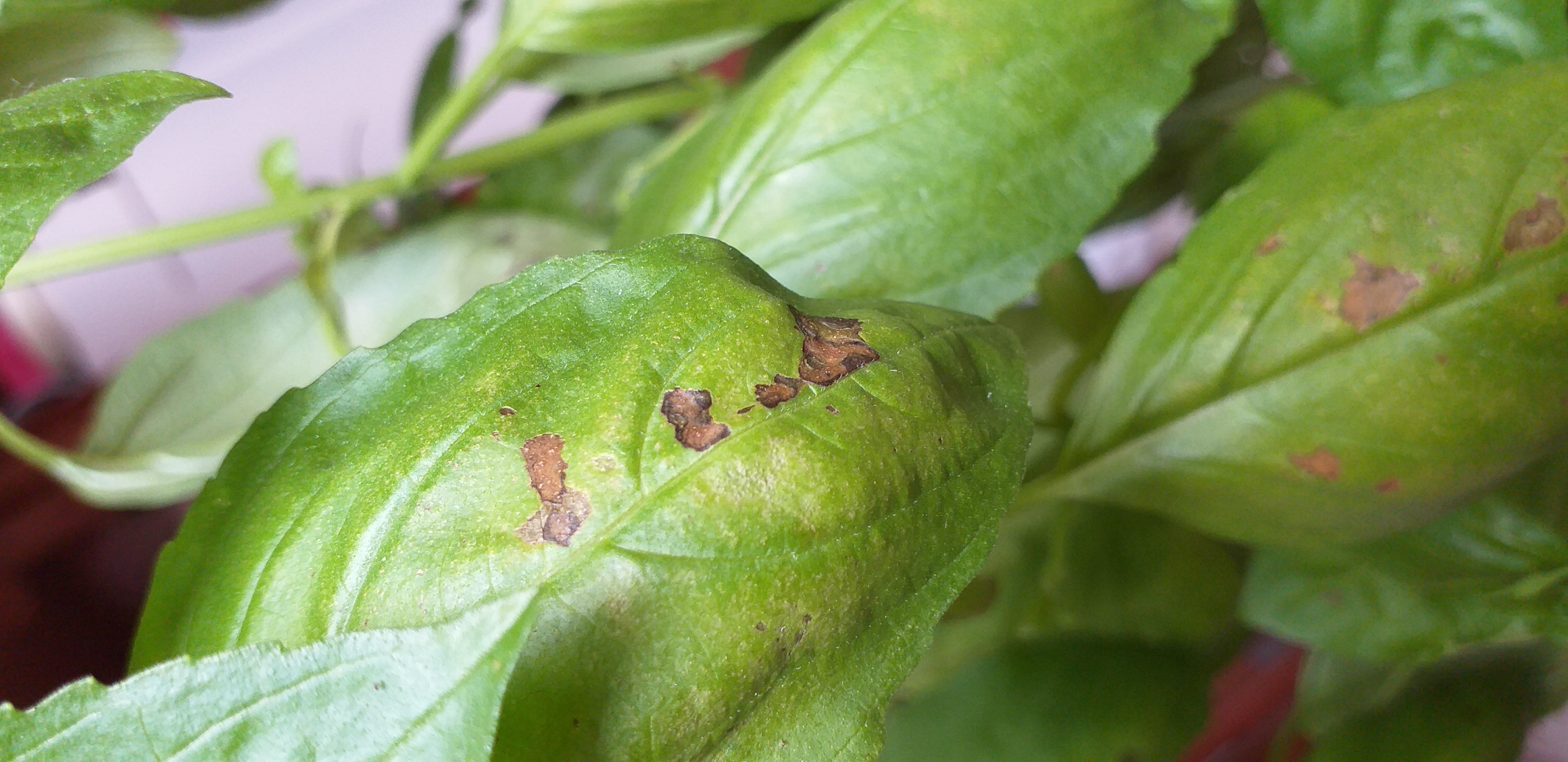 Magnéziumhiányból adódó foltoknak vélem. A sárguló levelek és tápanyaghiányra utalnak. Tegyen egy kevés összetett tápoldatot is az öntözővízbe, vagy keverjen műtrágyát a talajba. Ne öntözze túl, mert könnyen kirothad. Javaslat: https://www.gazdabolt.hu/szerves-tragya/2709-dcm-bio-zoldseg-es-fuszernoveny-tap-750-g.html