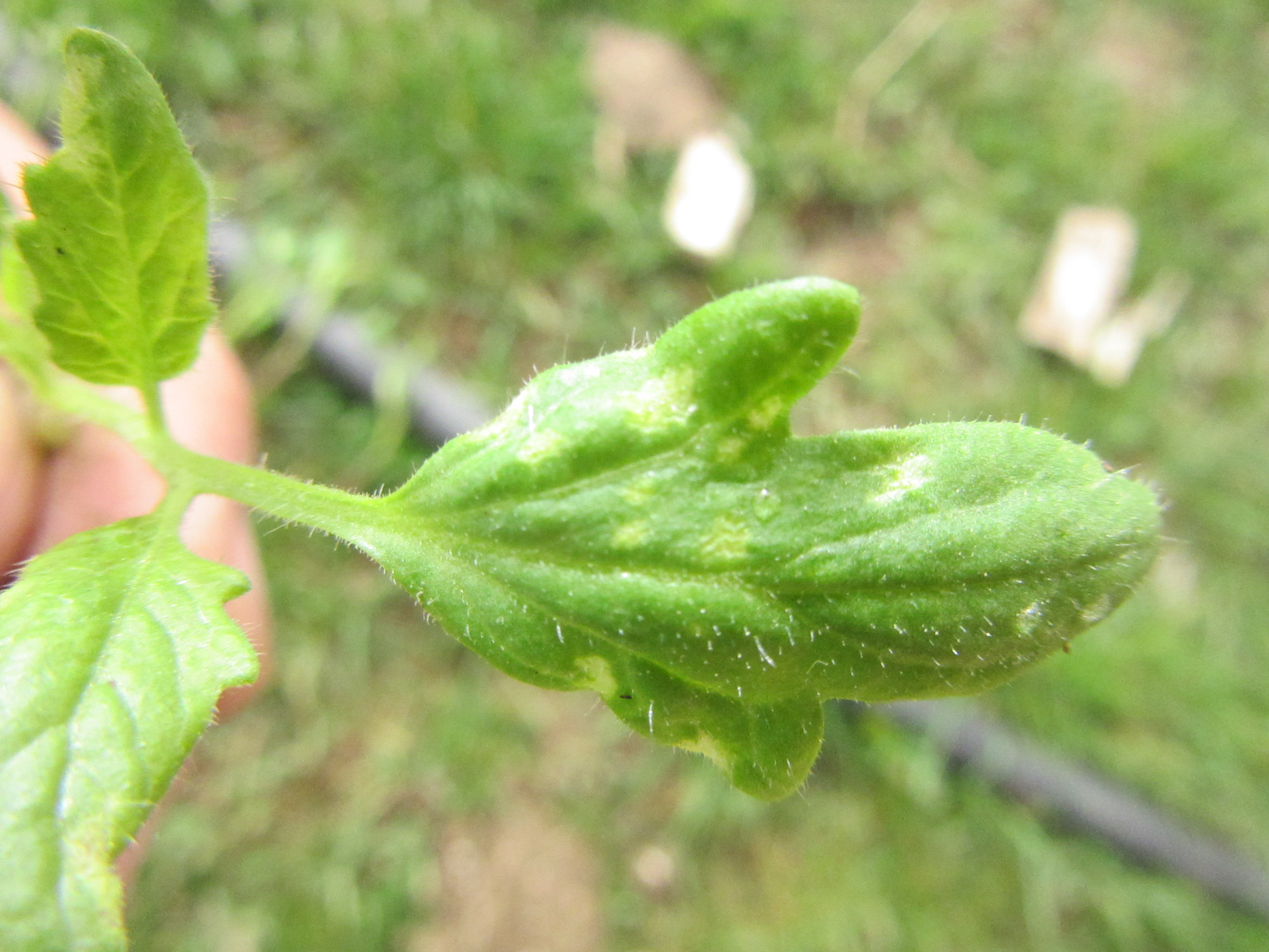 A 2. látható levelek foltosodását baktérium okozza. Rezes készítmények közül válasszon /Cuproxat, Champion, stb./ és hetente permetezzen.