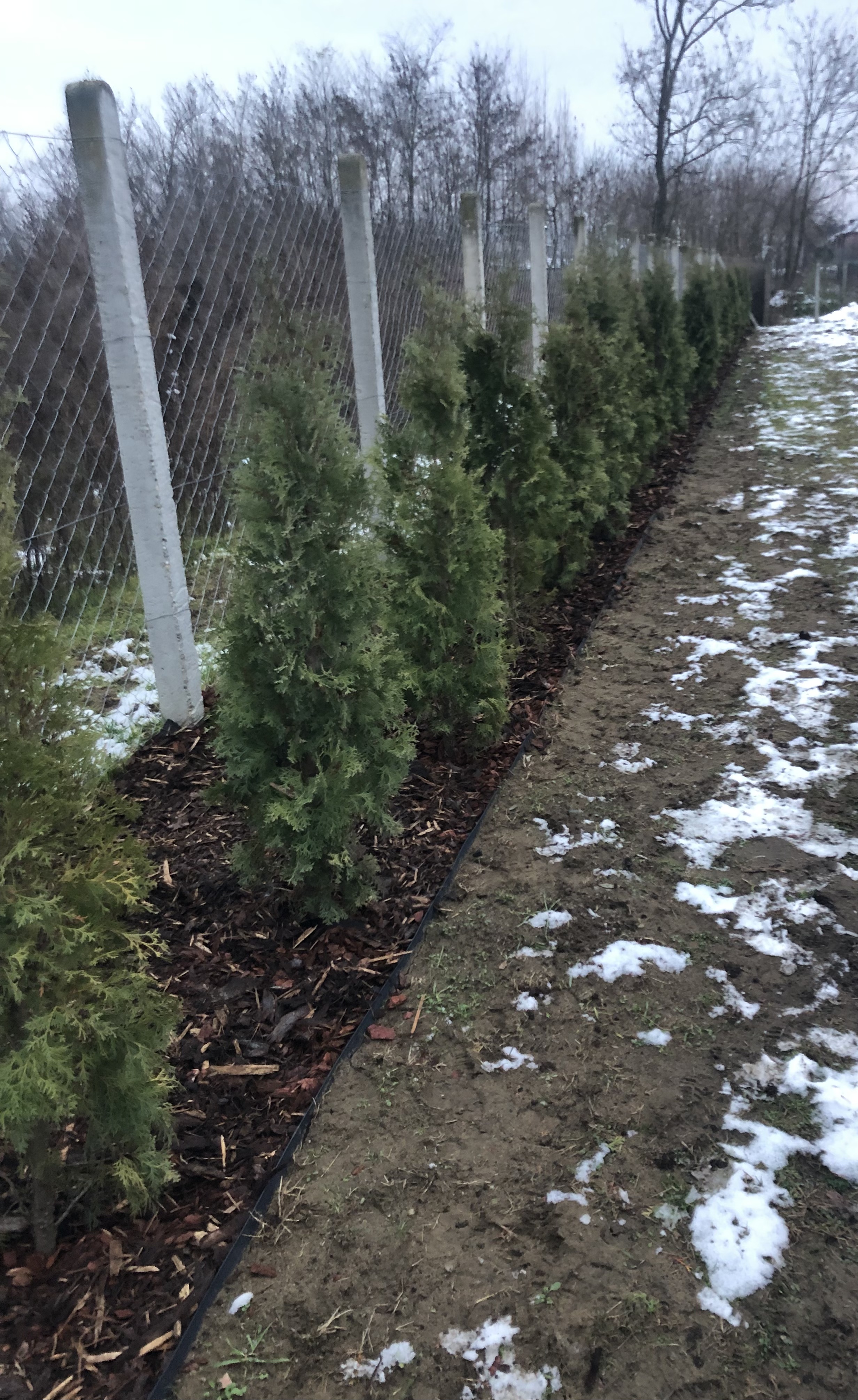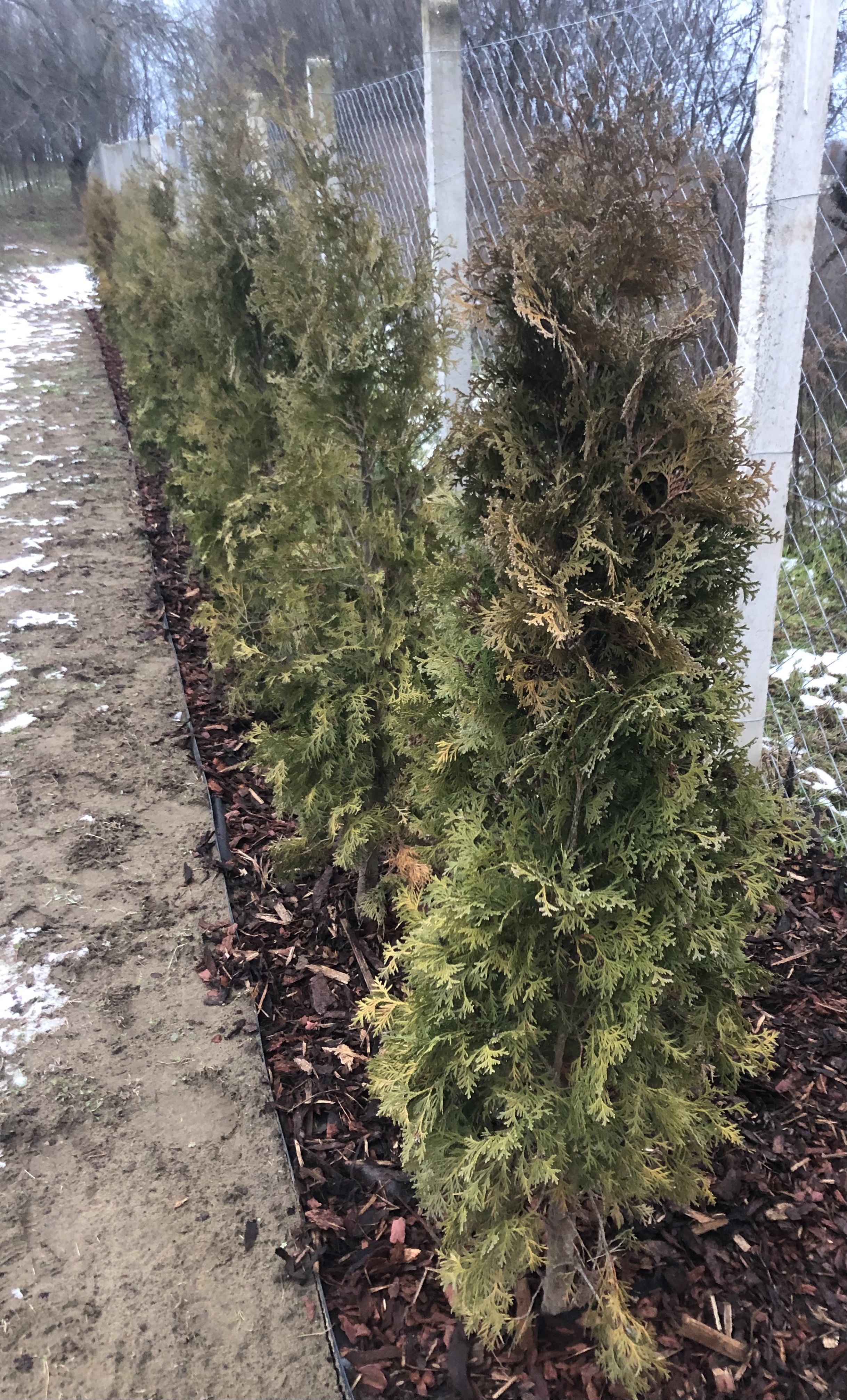 Segítségét szeretném kérni. Ez a columna tuja sor idén májusban lett ültetve. Ültető gödör aljába kerűlt talajfertőtlenítő, arra egy rèteg föld majd marhatrágya, ismét föld és végűl a tuja. Öntözve napi rendszerességgel volt nyáron. Ősszel heti 1 alkalommal bőségesen. Űltetés után 2-3 hónappal sárgulni kezdtek, valamelyik teljes egészében, némelyik a csúcsánál vagy foltokban. Ajánlásra gomba ölő permetezést alkalmaztam majd rá követő napon rovar ölő permetezést. Sajnos nem javított a helyzeten azóta is jelennek meg újabb sárgulások.
