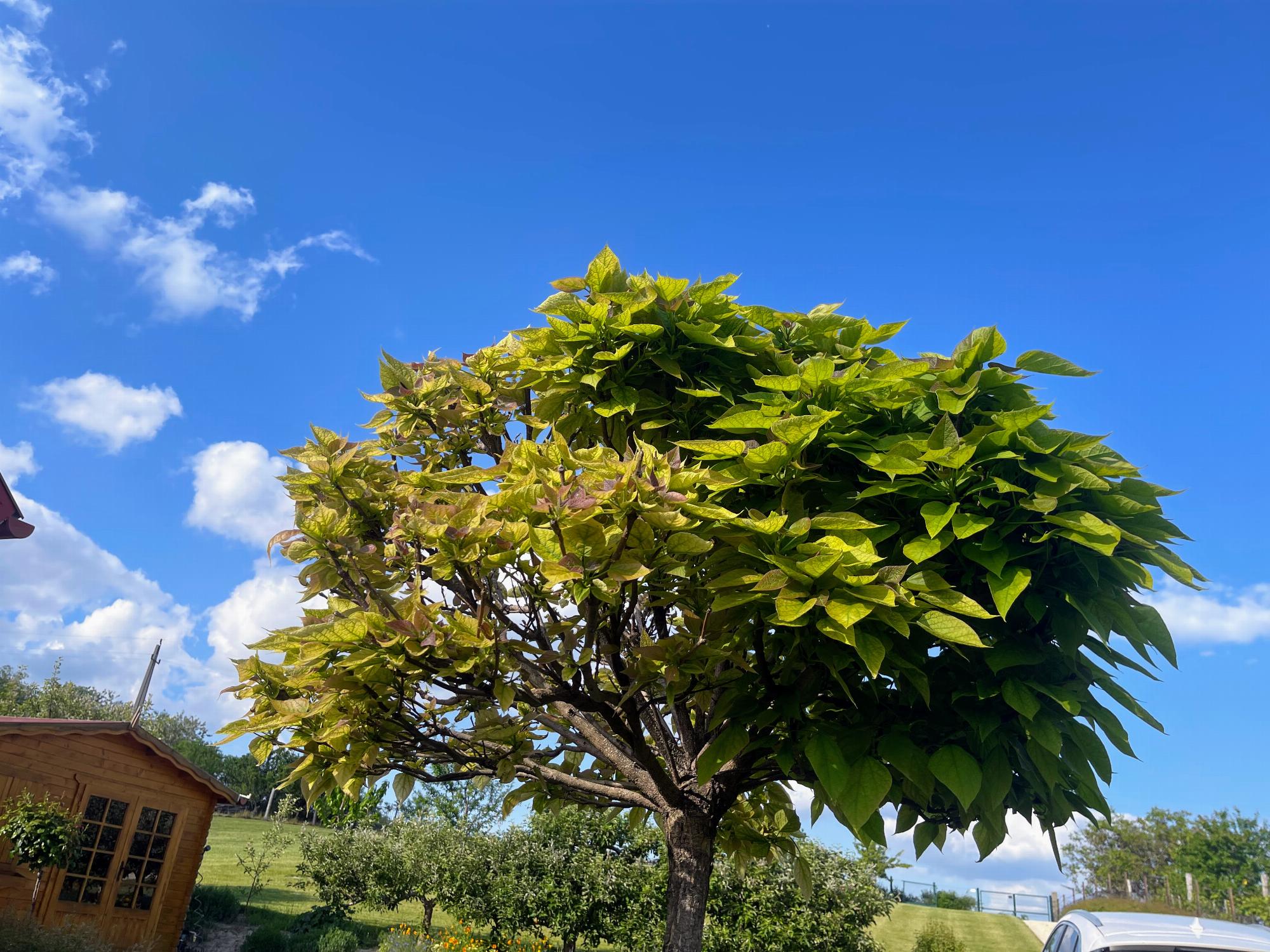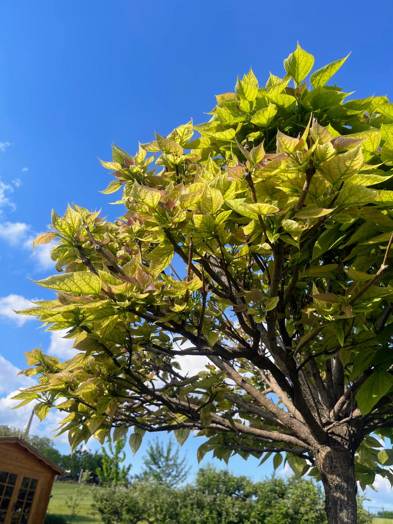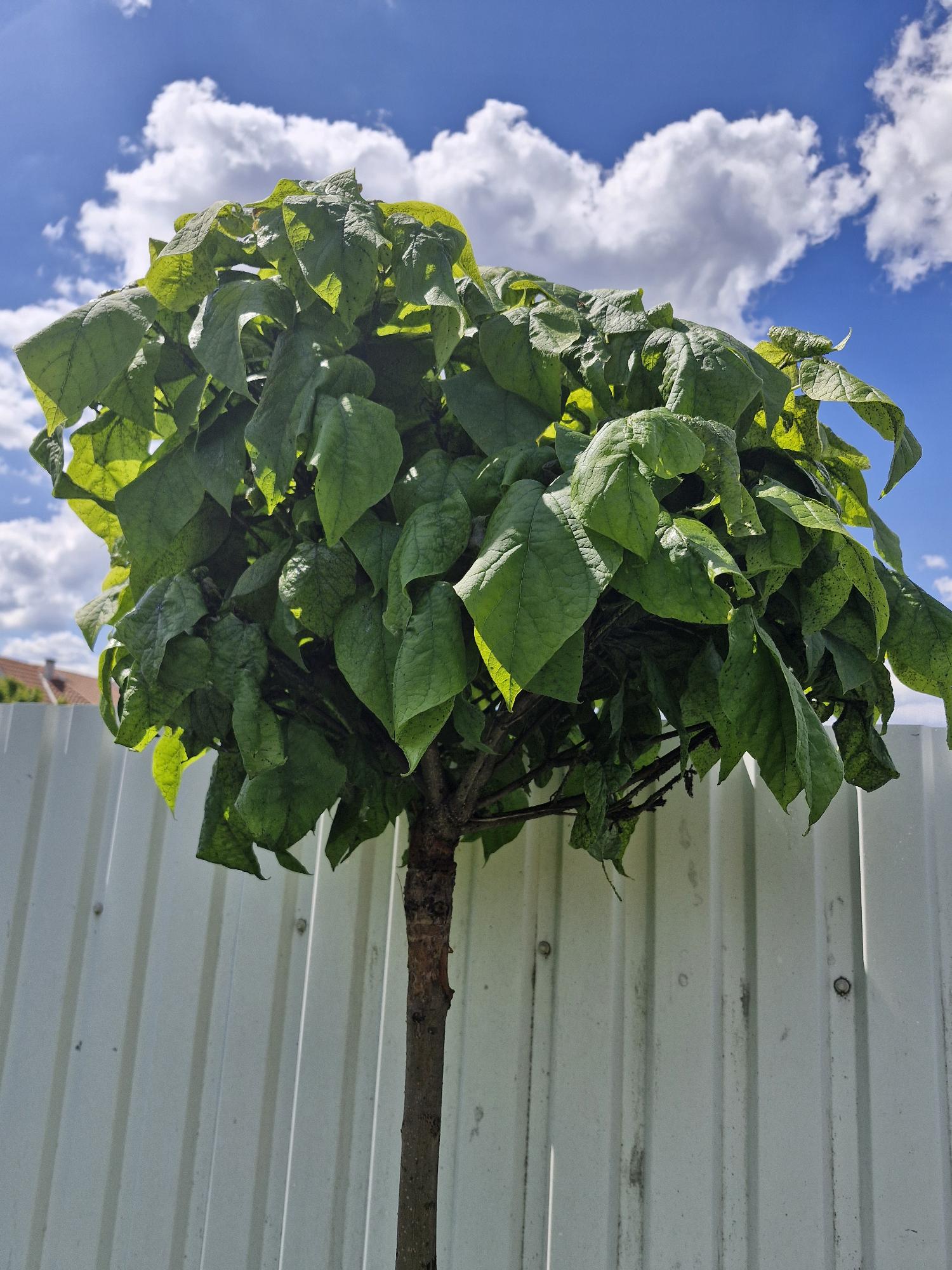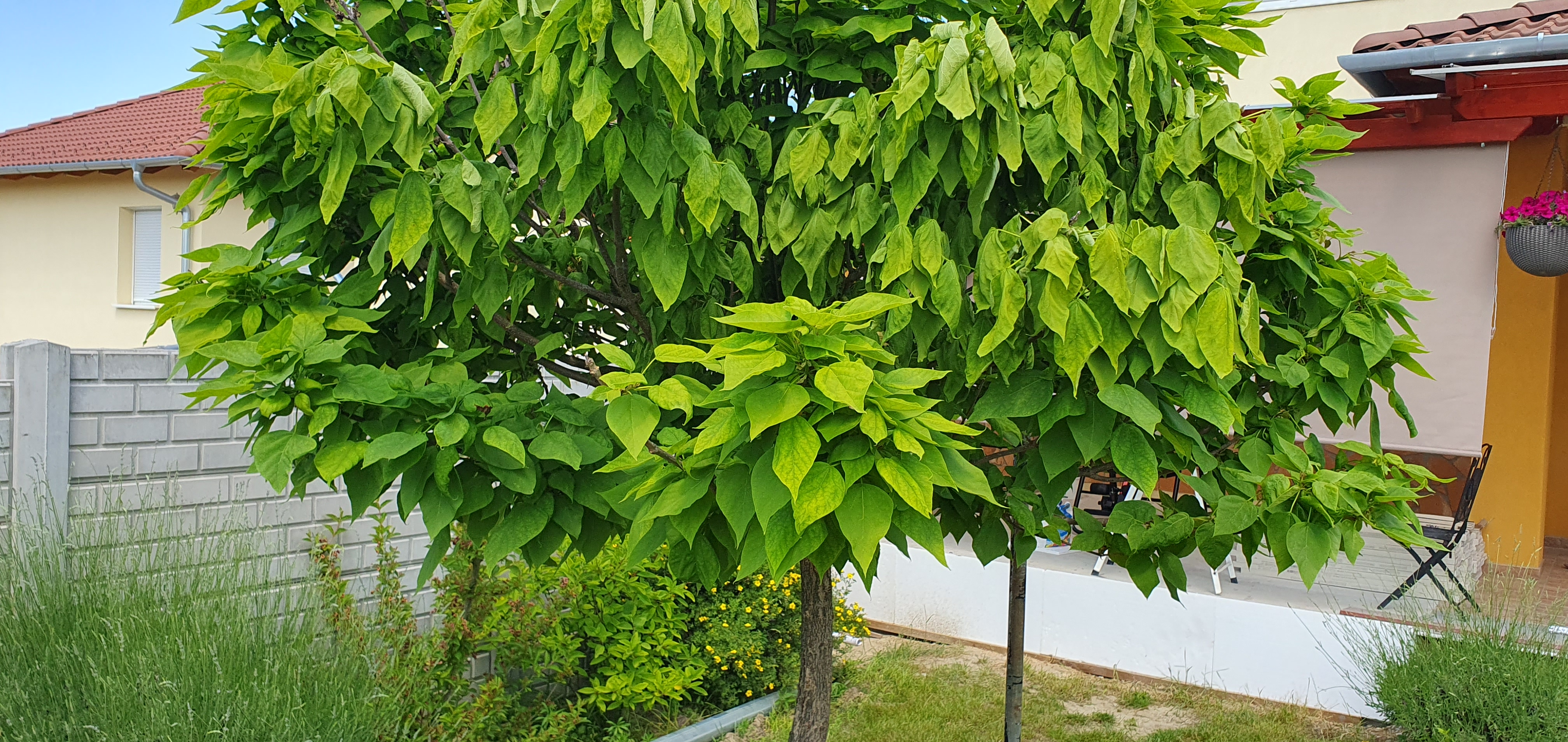 Május végén ültetett szivarfánk jelenleg így néz ki. Érdeklődni szeretnék, hogy kell -e tartanunk valami betegségtől, ami megtámadhatta a fát illetve milyen lehetőségeink vannak, hogy szebbé tegyük? Válaszukat előre is köszönöm!