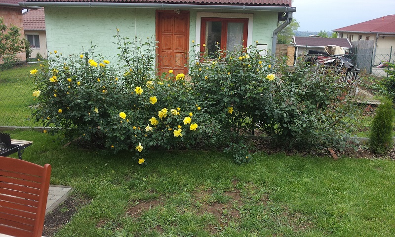 Élénksárga futórózsa épp akad folyton termő: "Good as Gold" nevezetű, igen jellegzetes alakú virágokkal, igaz, ez csupán alacsonyabbra futtatható (kb 2m-re). Illata édes és üde, fényes levelű.