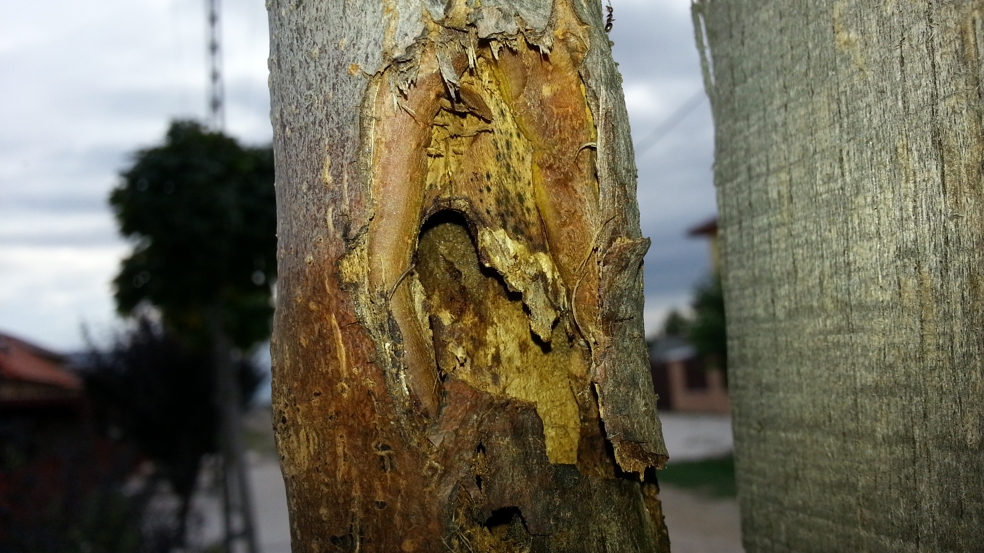 2 éve ültettem 3 db gömbjuharfát, s az egyik törzsén a képen látható sérülésre lettem figyelmes. Elég megdöbbentő, s nem tudom mi okozhatta ezt a jelentős rongálást. A "seb" alsó része eredetileg egy kéreg alá vájt járatszerűség volt, onnan a kéregmaradványt már én vettem le. A fa lombjának a színe is láthatóan halványabb a másik kettőnél, gondolom ez is a sérüléssel van összefüggésben...