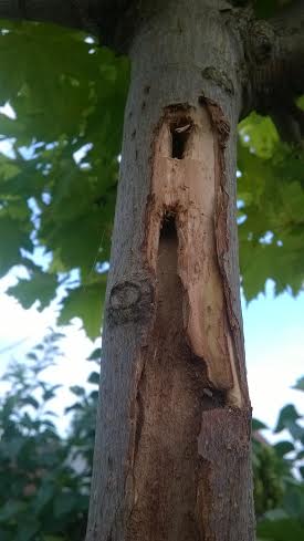 A baj oka régebbre vezethető vissza, nem most alakult ki hirtelen. Egy korai fagyléc a növekedés során kiszélesedett, és kéregkártevők telepedtek meg (pl. szú, farontó lepke-hernyója stb.) A lyukakat a fakopáncs tovább mélyítette. Sajnos, előbb kellett volna beavatkozni. A kéregrepedést egészséges részig ki kell metszeni, A lyukakat kitisztítani, betömni (vigyázzon! Lehet, hogy madár költözött bele!), pl. pur habbal. Az egészet fasebkezelővel lekezelni, és fáslival bekötözni a törzset!
