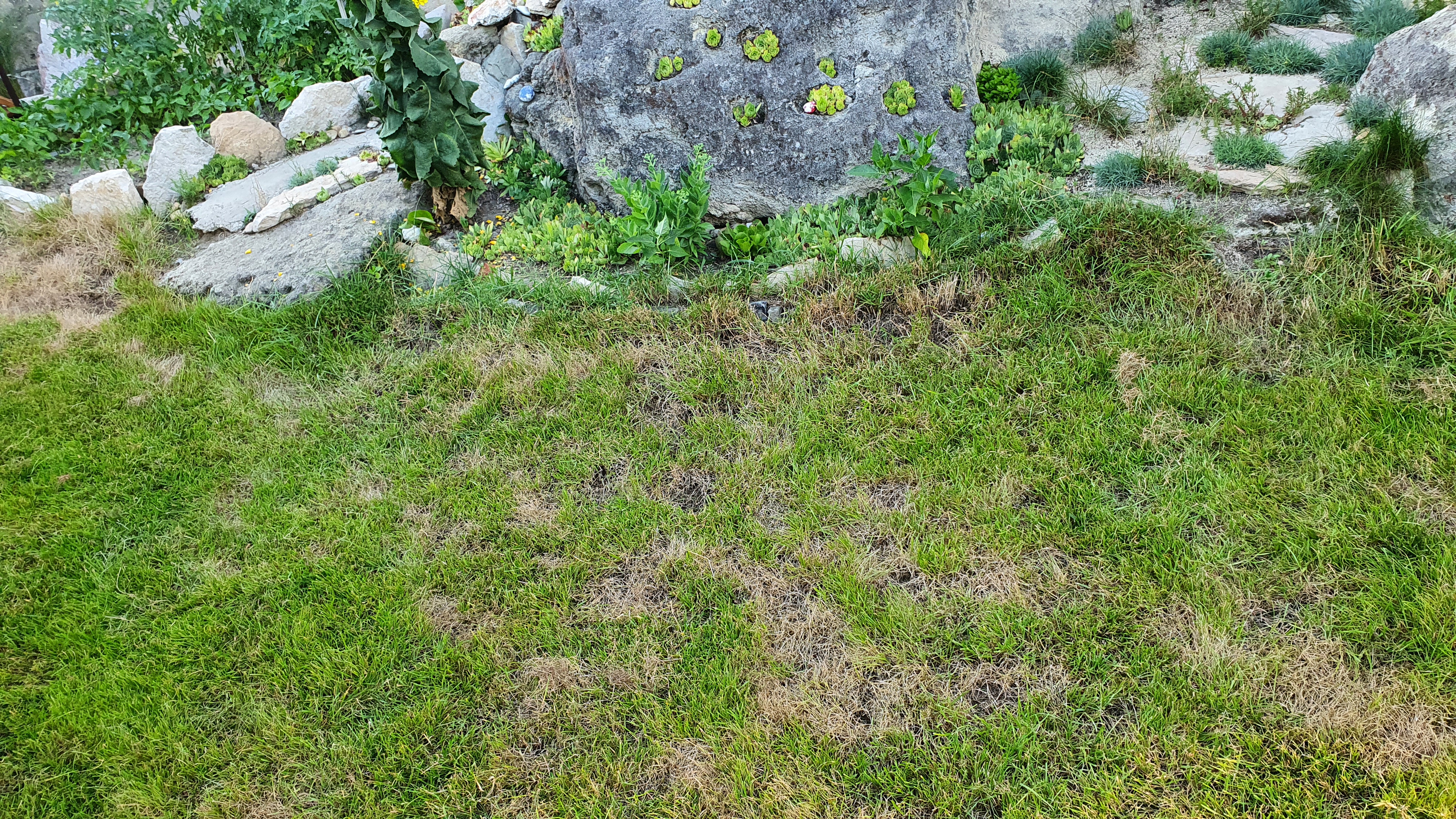 Szeretném megkérdezni, hogy mi okozhatja a képen látható fű foltokban történő száradását, kb. 2-3 hete jelent meg az első ilyen folt, most már több helyen is látható, rendszeres locsolás mellett. A fű tavaly ősszel lett telepítve, eddig szép zöld volt mindenhol. A fű alatti földréteg nem egyforma mély, alatta mészkő réteg is található, elég sok a természetes szikla.